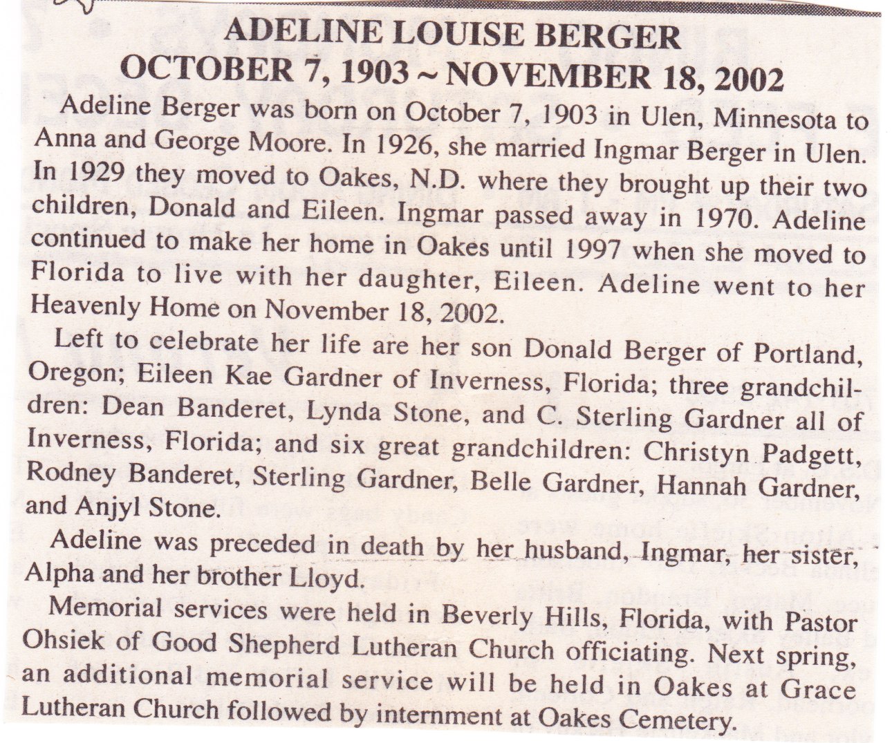 OCTOBER 7, 1903 - NOVEMBER 18, 2002Adeline Berger was born on October 7, 1903 in Ulen, Minnesota to Anna and George Moore. In 1926, she married Ingmar Berger in Ulen. In 1929 they moved to Oakes, N.D. where they brought up their two children, Donald and Eileen. Ingmar passed away in 1970. Adeline continued to make her home in Oakes until 1997 when she moved to Florida to live with her daughter, Eileen. Adeline went to her Heavenly Home on November 8, 2002. Left to celebrate her life are her son Donald Berger of Portland, Oregon; Eileen Kae Gardner of Ivverness, Florida; three grandchildren: Dean Banderet, Lynda Stone, and C. Sterling Gardner all of Inverness, Florida; and six great grandchildren: CHristyn Padgett, Rodney Banderet, Sterling Gardner, Belle Gardner, Hannah Gardner, and Anjyl Stone. Adeline was preceded in death by her husband, Ingmar, her sister, Alpha and her brother Lloyd. Memorial services were held in Beverly Hills, Florida, with Pastor Ohsiek of Good Shepherd Lutheran Church officiating. next spring, an additional memorial service will be held in Oakes at Grace Lutheran Church followed by internment at Oakes, Cemetery. Source: The Oakes Times, December 12, 2002. Click for obit. Submitted by Char Kibbie [August 2013].