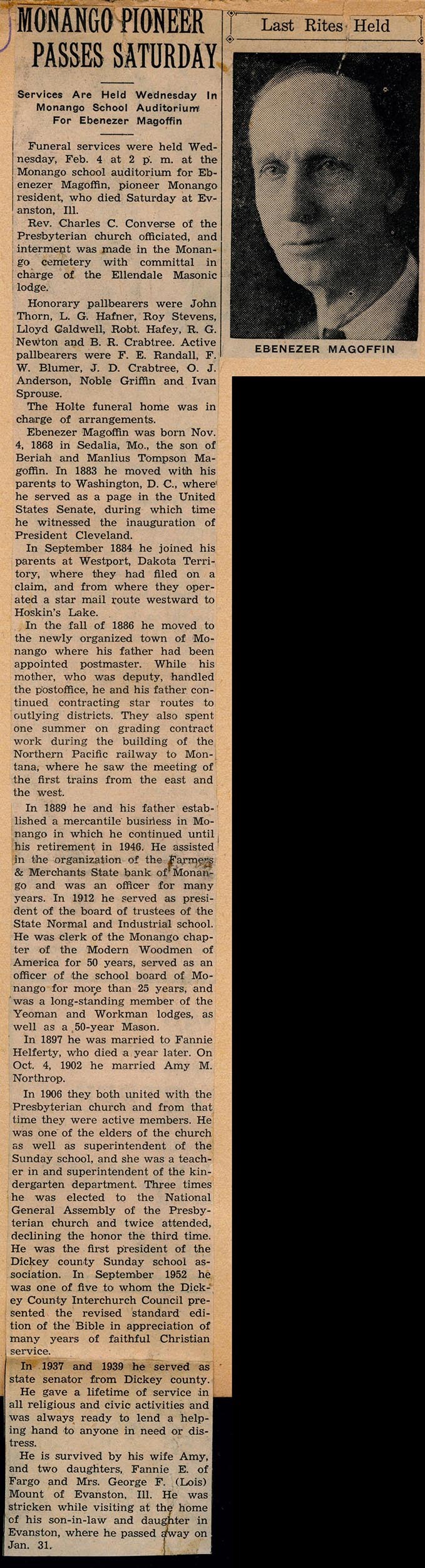 Rites today for past LegislatorThe funeral for Edwin N. Davis, 77, a retired Monango farmer and past state legislator, will be held today (Thursday) at 2 p.m. at Zion Lutheran Church in Ellendale. The Rev. Leo Deitemeyer will officiate. Holte Funeral Homes, Inc., is in charge of arrangements. Interment will be in the Ellendale Cemetery. Mr. Davis was born on Aug. 14, 1902, in Grand Valley Township in Dickey County to Newton E. Davis and Emma M. Brander. He married Mary Gebhardt on Feb. 24, 1933 at Leola, S.D. Mr. Davis was preceded in death by his parents, two brothers, and two sisters. He is survived by his wife Mary, Monango; two sons, J. Bartley Davis, Jamestown, and Newton E. Davis, Monango; two daughters, Mrs. Lowell (Anna Mae) Edwards, Canton, S.D., and Mrs. James (Joan) Jackson, St. Paris, Ohio; one brother, Frank Davis, Ellendale; a sister, Mrs. Ella Mae Berdahl, Washington, D.C. A Republican, Mr. Davis served in the North Dakota House of Representatives from 1953 to 1965. In addition to being a past county chairman for the Republican party, the deceased was also a past school clerk for the Spring Valley School District, a post he held for 30 years, and past treasurer of the township board, a position he also held for 30 years. Mr. Davis lived and farmed in the Monango area all of his life. Pallbearers at Mr. Davis' funeral are Douglas Davis, Newton E. Davis, Brian Davis, Dale A. Davis, Kim Davis, and Colby Edwards. Source: probably the Dickey County Leader, January 1979. Click for obit. Submitted by Verna June Sorlie Rossevelt, grand niece (Nov. 2010) Note: To avoid confusion with his father, he went by Edwin Newton Davis most of his life. -vjsr