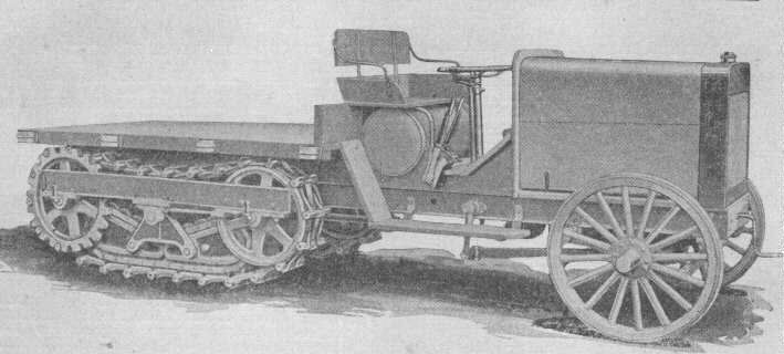 It will work on all kinds of ground because it is of the self-laying track or caterpillar type and has flexible lag bed of our own design and patent. It fits in the hollow places and bends over the knolls and obstacles in the roads and across the lots; in fact, it will run anywhere that a man can walk and draw a good load behind.