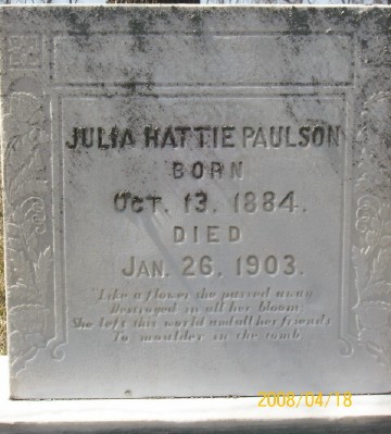 | PAULSON, Christian (Father) PAULSON, Bertha (Mother) PAULSON, George D. PAULSON, Julia Hattie PAULSON, Bill A. PVT ICL, 336 M.G. BN 87 Div. | ----/--/-- 1867/--/-- 1882/10/10 1884/10/13 ----/--/-- | ----/--/-- 1941/--/-- 1956/10/20 1903/01/26 1941/01/01 | Photo | Pat | // | // |