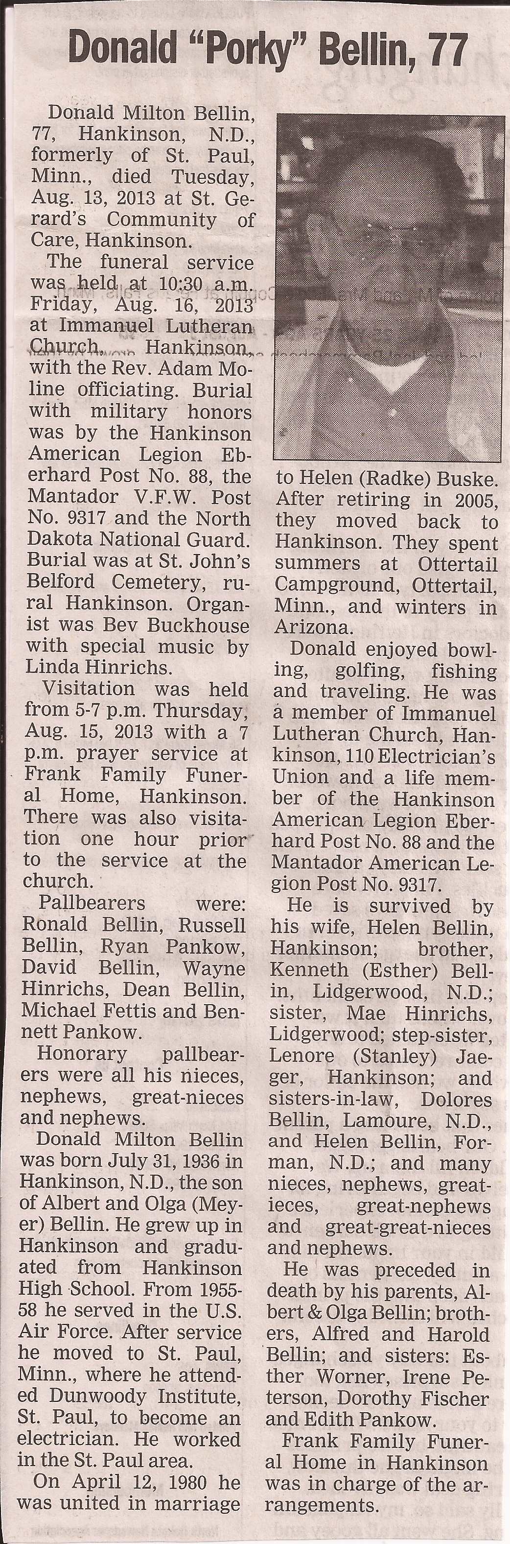 | BELLIN, Donald Milton 'Porky' | // | 1936/07/31 | 2013/08/16 | // | Obit. |