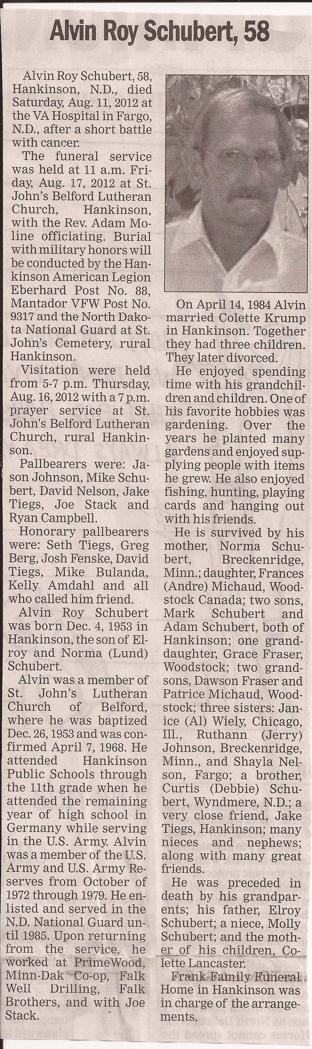 SCHUBERT, Norma L. (Mar. 1946/08/23) Children: Janice, Curtis, Shayla, Ruth Alvin |
