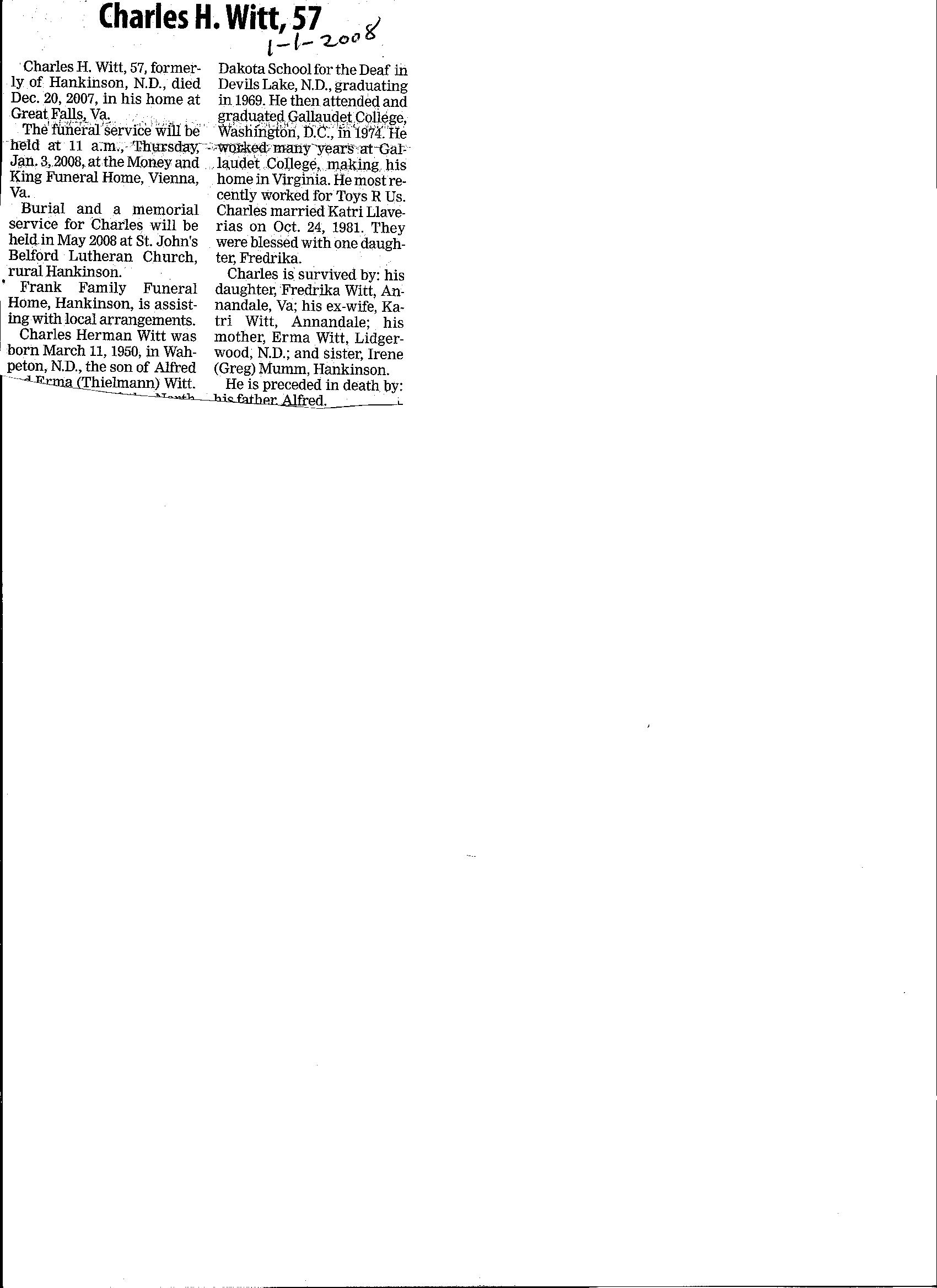 | WITT, Charles H.(57) | Great Falls, VA | 1950/03/11 | 2007/12/20 | // | Obit. |