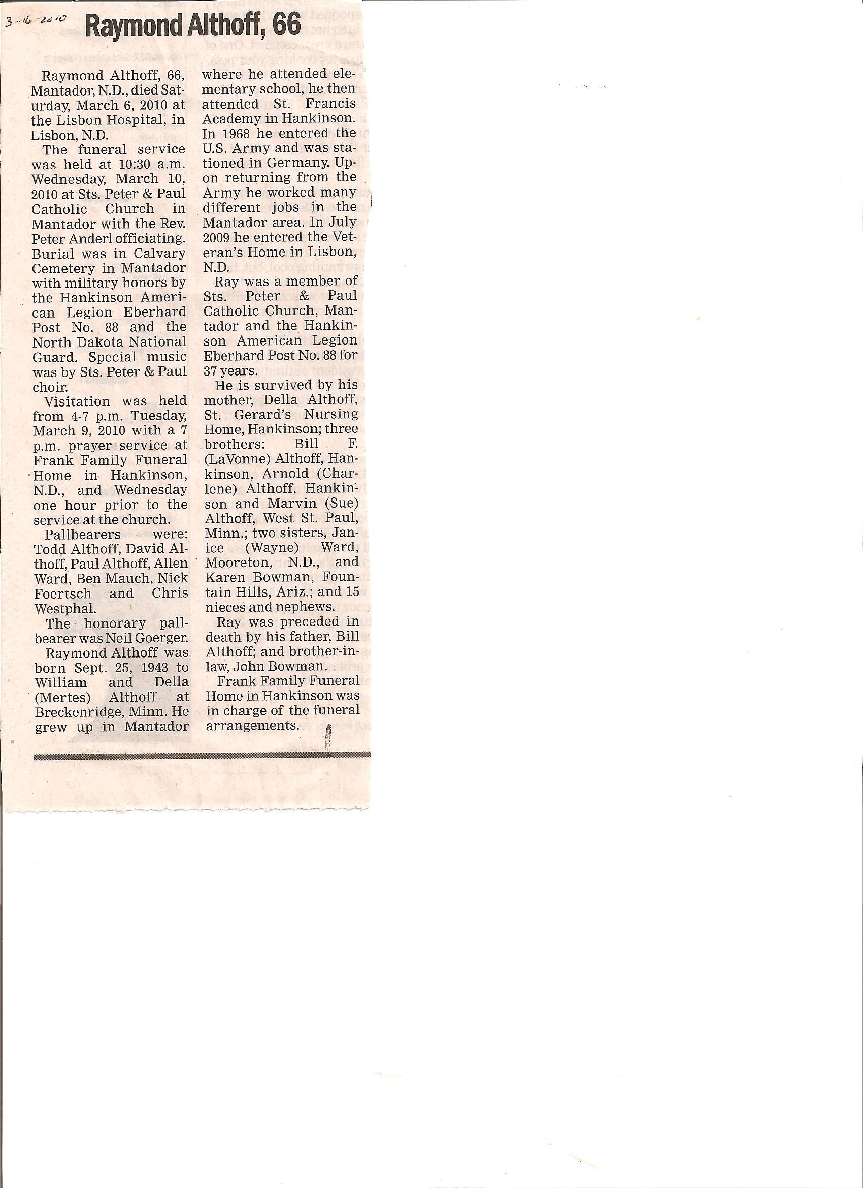 | ALTHOFF, Raymond | 1943/09/25 | Breckenridge | 2010 Mar. 6 | Lisbon Hospital | // | Obit. | |