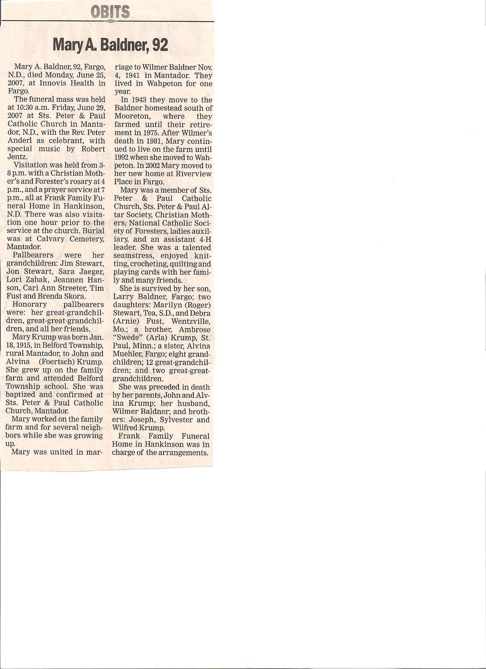 | BALDNER, Mary A. | 1915/01/13 | Belford Township, rural Mantador | 2007/06/25 | Innovis Health, Fargo | // | Obit | |