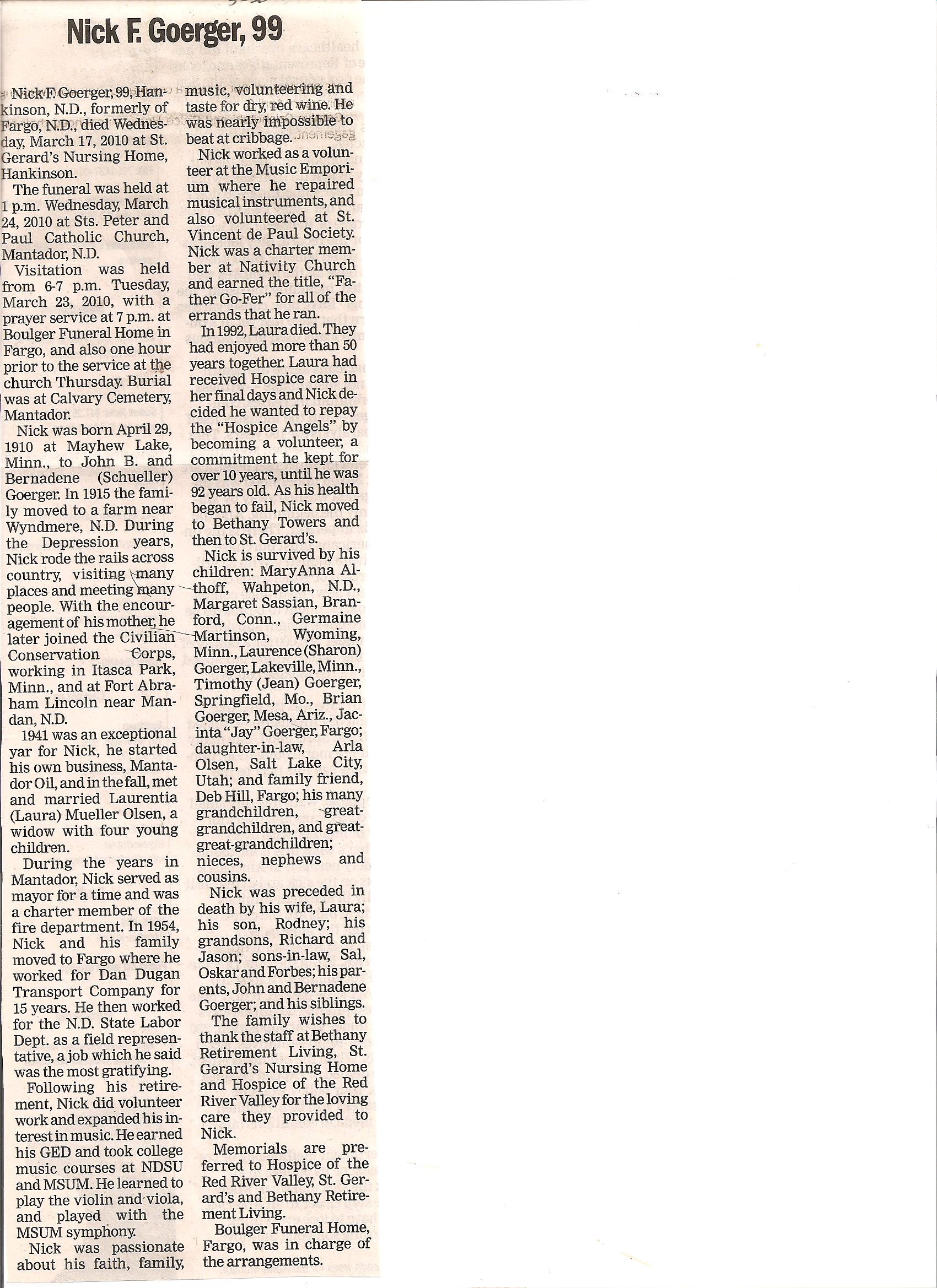 | GOERGER, Nick F. | 1910/04/29 | Mayhew Lake, MN | 2010/03/17 | // | // | Obit | |