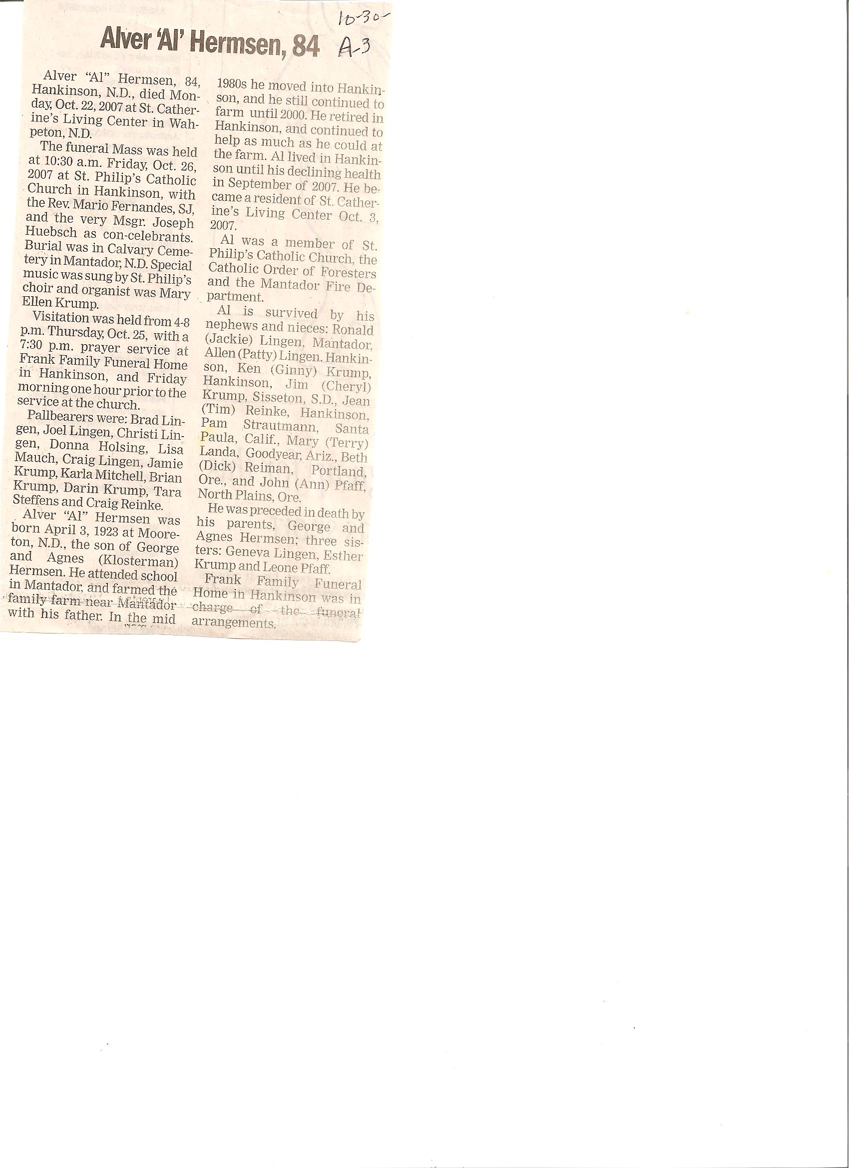 | HERMSEN, Alver 'Al' | 1923/04/03 | // | 2007/10/22 | // | // | Obit | |