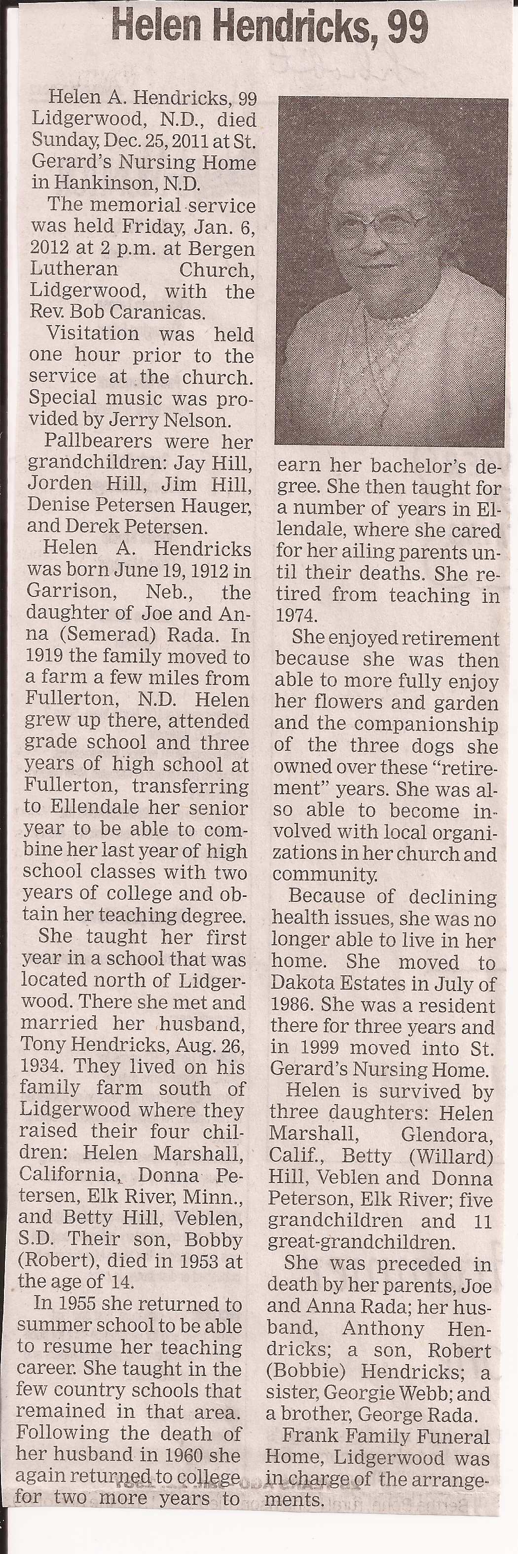| HENDRICKS (RADA), Helen | 1912/06/19 | Garrison, NB | 2011/12/25 | St. Gerard's Nursing Home, Hankinson | // | Obit | |