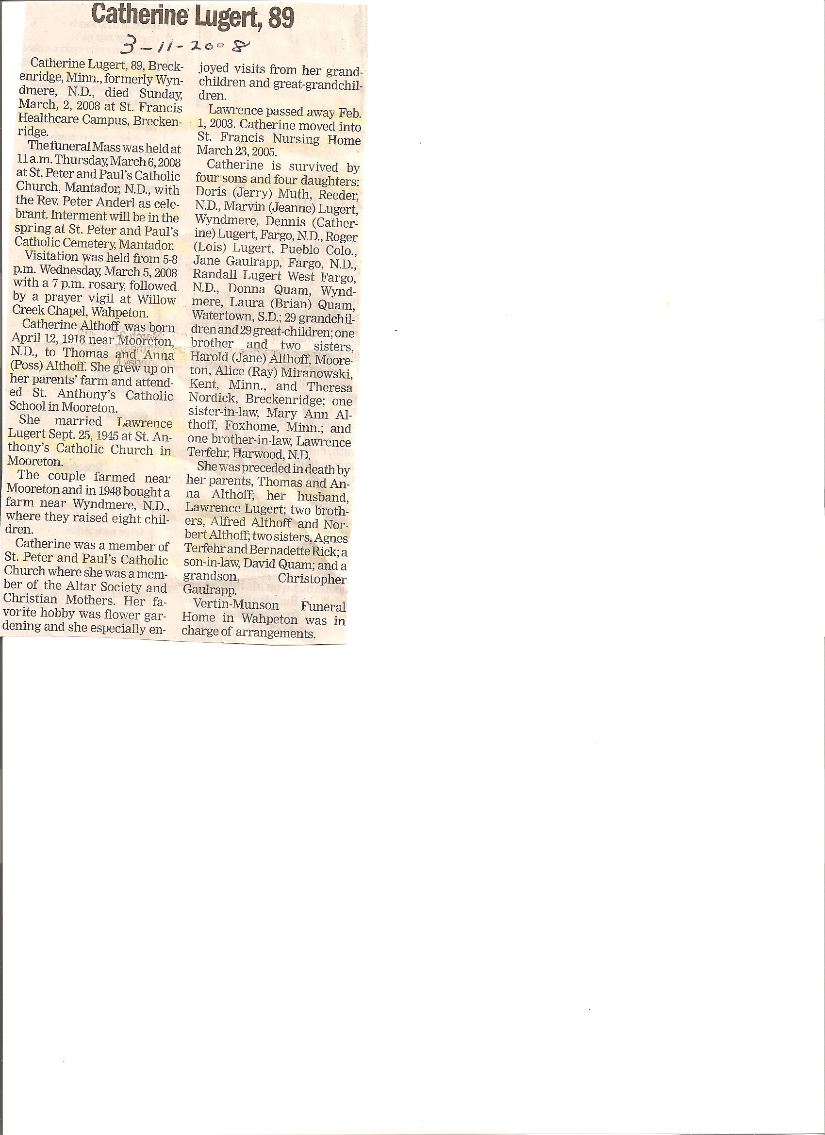 | LUGERT (ALTHOFF), Catherine | 1918/04/12 | Near Moorton | 2008/03/02 | St. Francis Healthcare Campus, Breckenridge | // | Obit | |