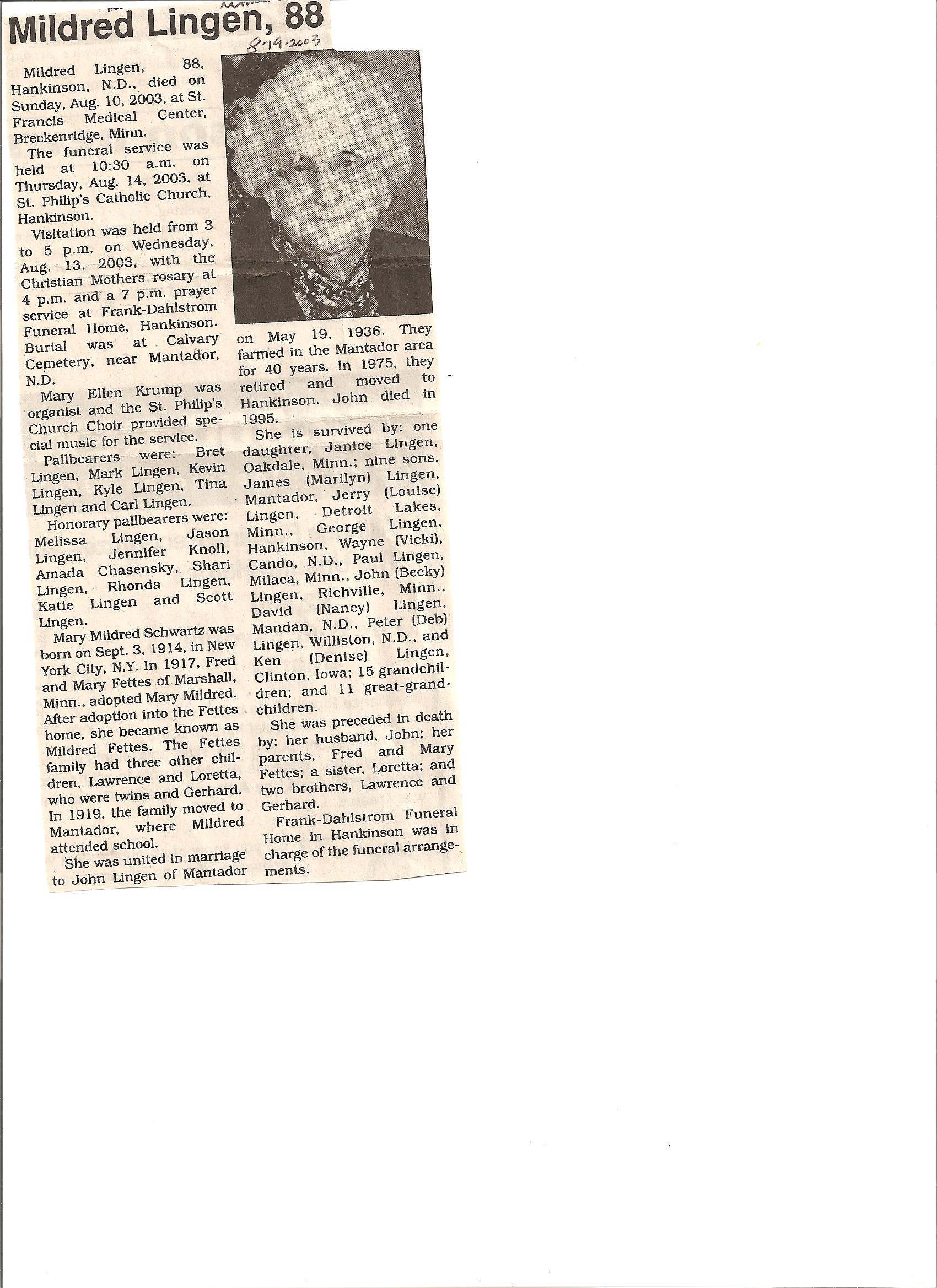 | LINGEN (SCHWARTZ)(FETTES), Mildred | 1914/09/03 | 2003/08/10 | // | // | Obit | ||