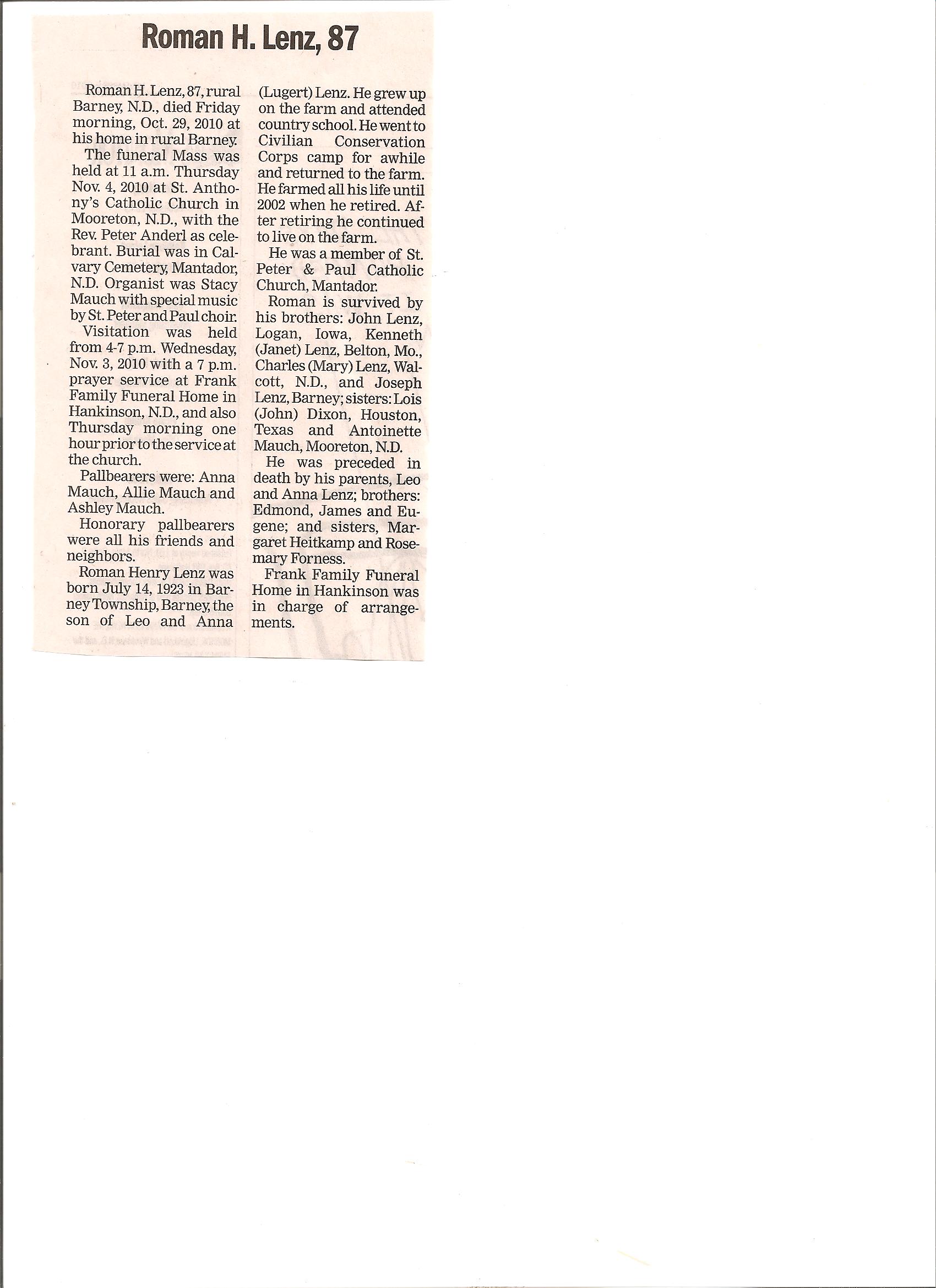 | LENZ, Roman H. | 1923/07/14 | // | 2010/10/29 | // | // | Obit | |