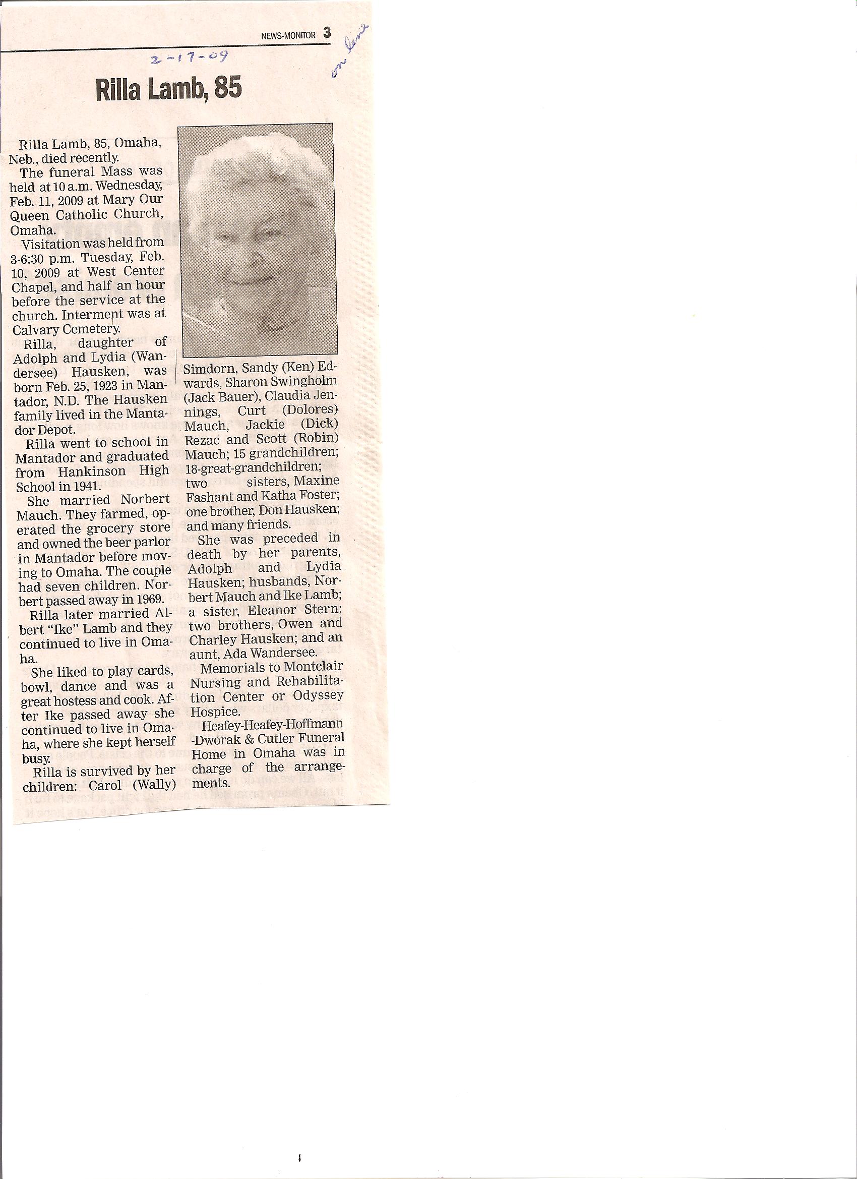 | LAMB, Rilla | 1923/02/26 | Mantador, ND | ----/--/-- | Omaha, Nebraska | // | Obit | |