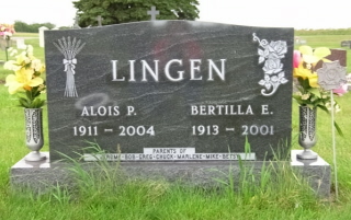 | LINGEN, Alois P. LINGEN, Bertilla E. Parents of Jerome, Bob Greg, Chuck, Marlene Mike, Betsy | 1911/--/-- 1913/--/-- | // | 2004/--/-- 2001/--/-- | // | Photo | // | |