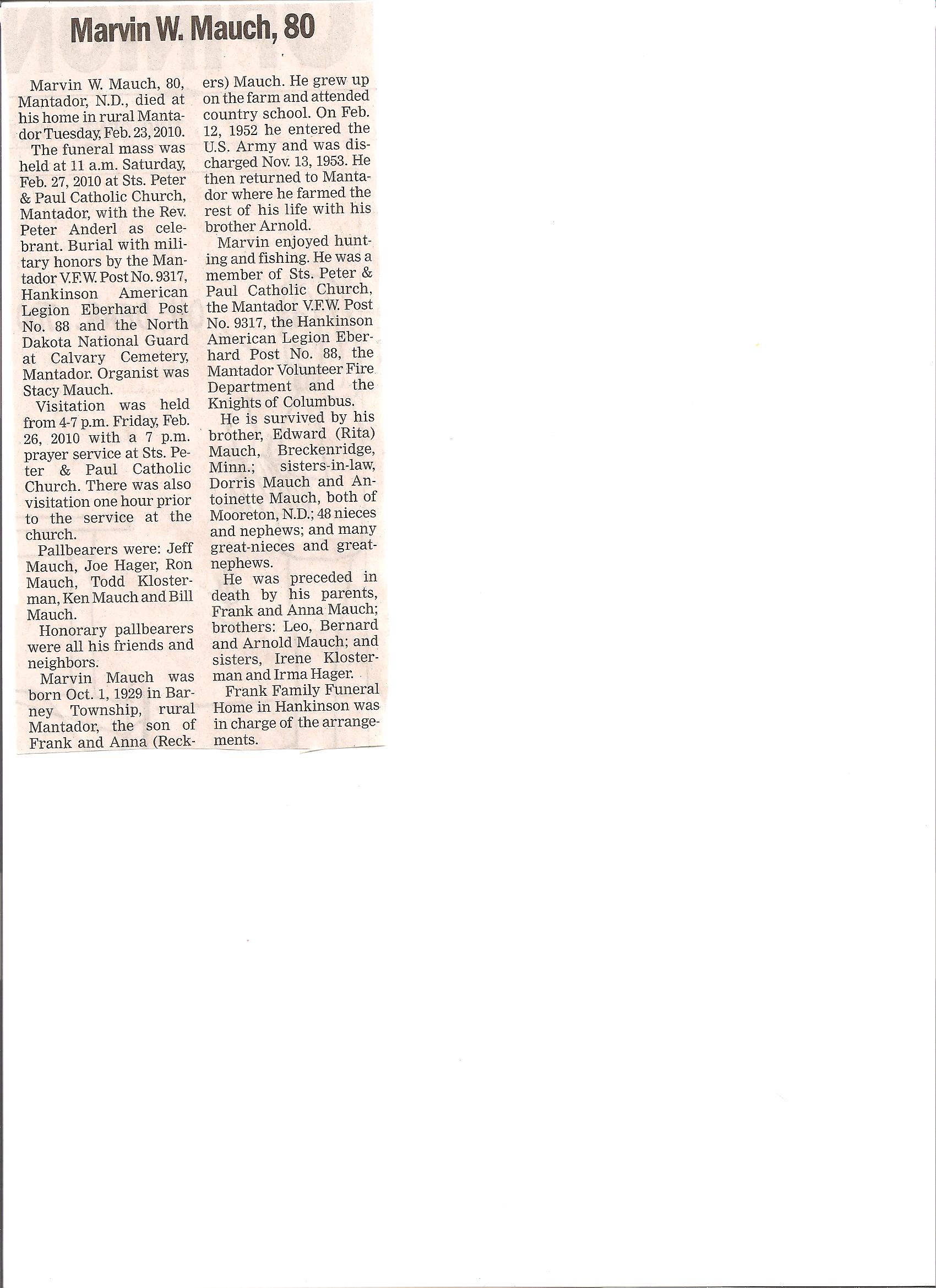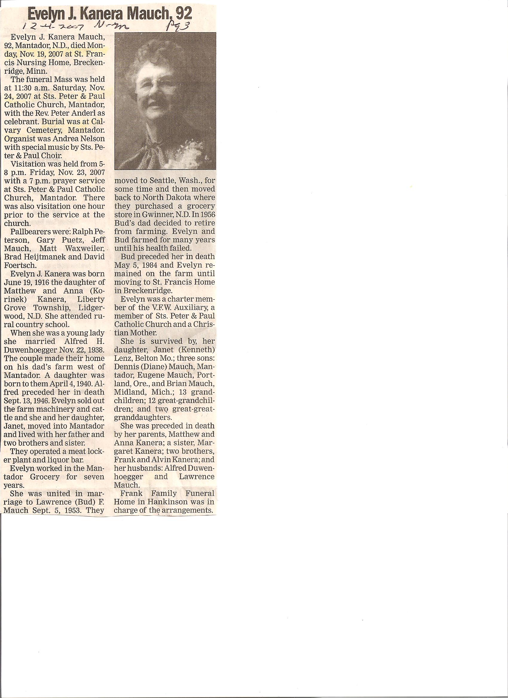 | MAUCH (KANERA), Evelyn J. | 1916/06 | Liberty Grove TWP. Rural Lidgerwood, ND | 2007/11/19 | // | // | Obit | |