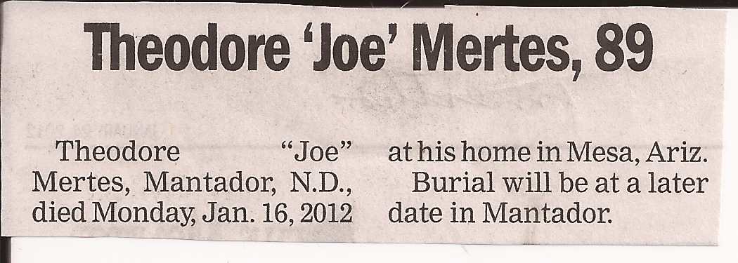 | MERTES, Theodore 'Joe' | ----/--/-- | His home in Mantador | 2912/01/16 | // | // | Obit | |