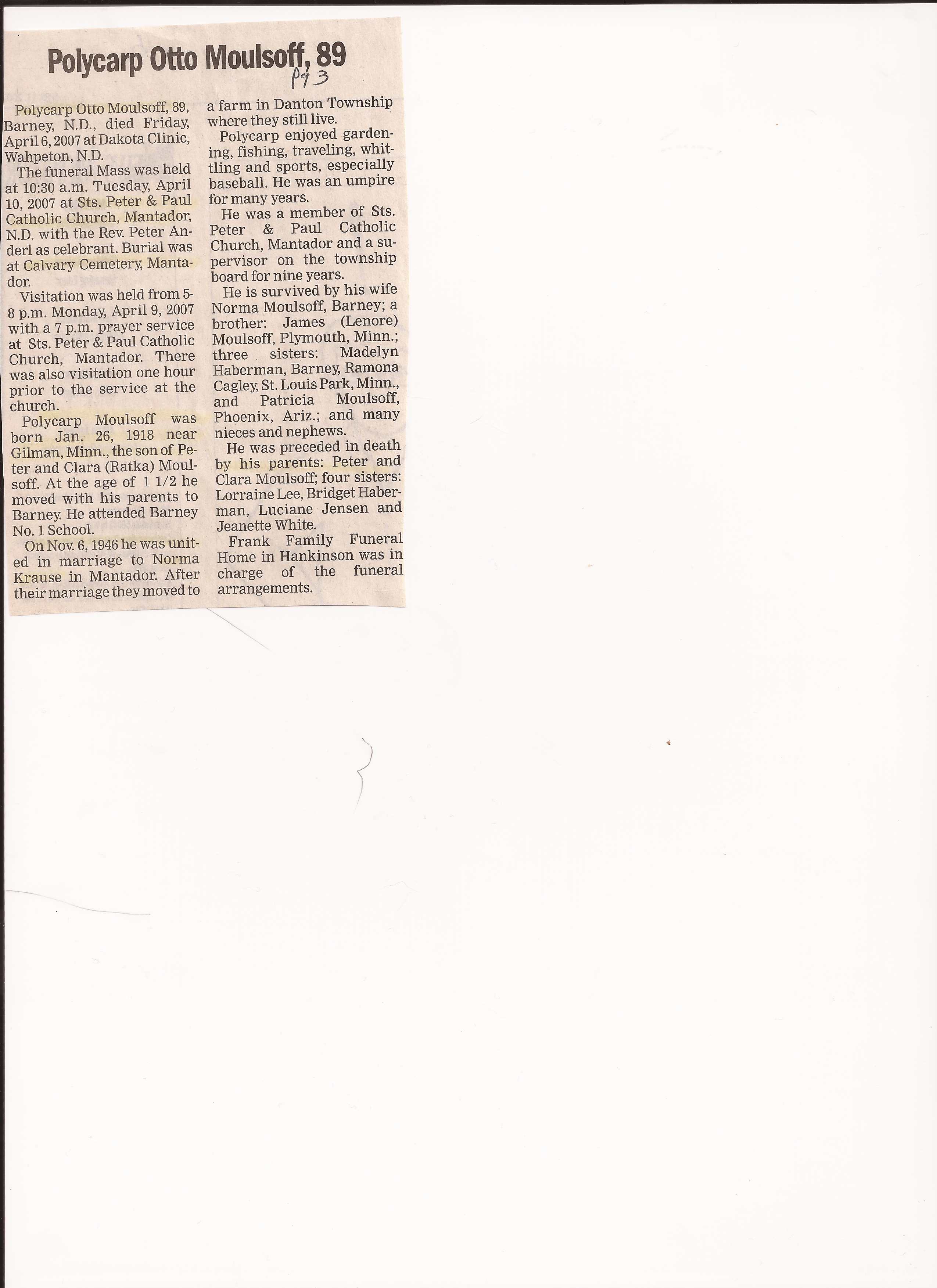 | MOULSOFF, Polycarp Otto Loving Husband of Norma | 1918/01/26 | Near Gilman, MN | 2007/04/06 | Dakota Clinic, Wahpeton | Photo | Obit | |