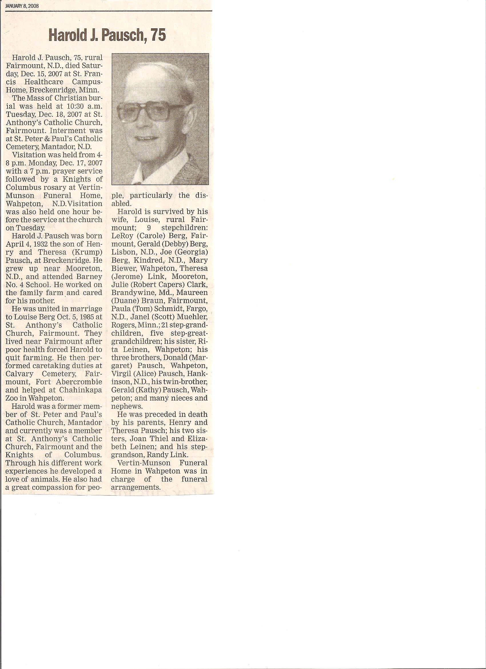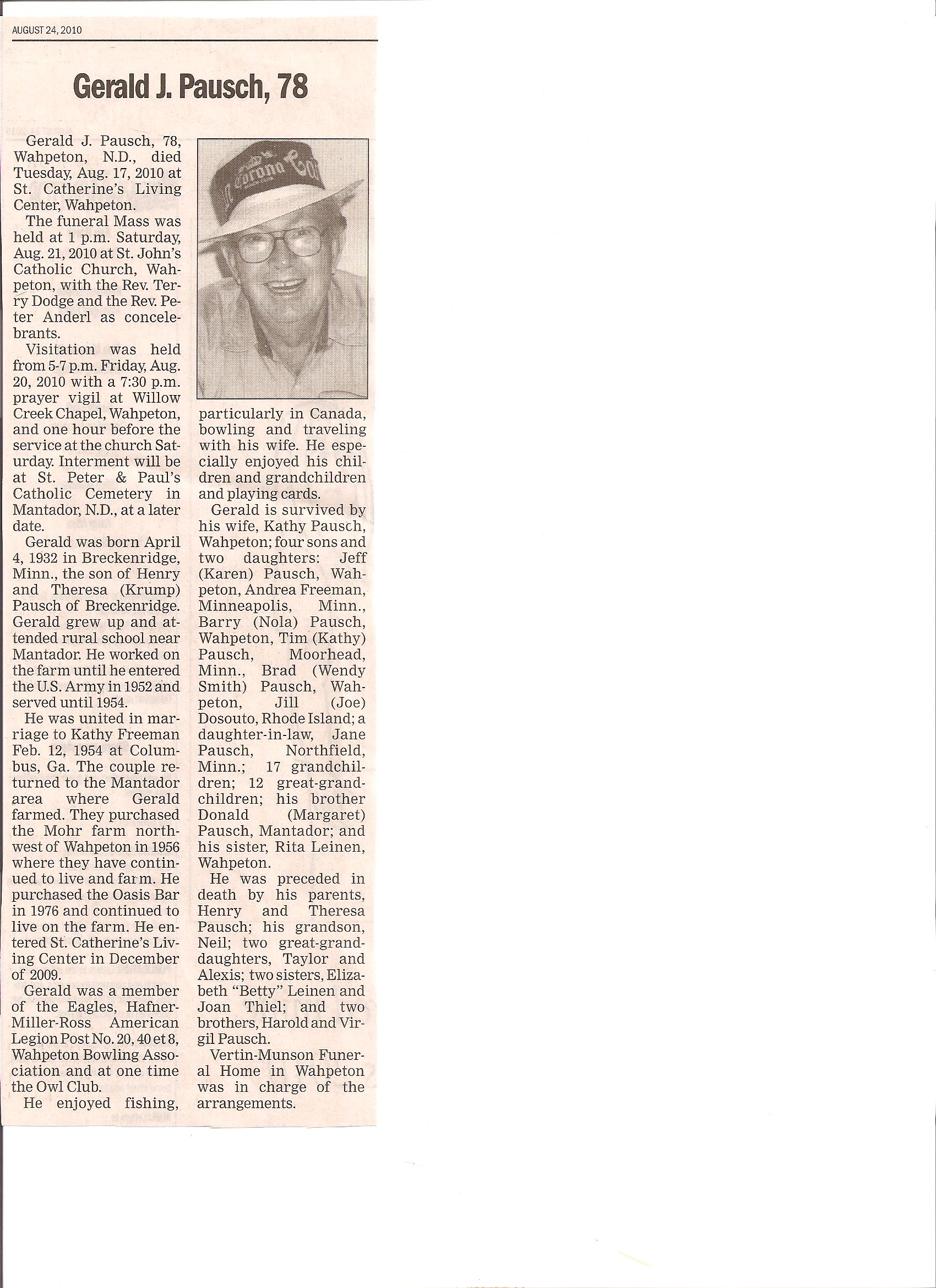 | PAUSCH, Gerald J. | 1932/04/04 | Breckenridge, MN | 2010/08/17 | St. Catherine's Living Center, Wahpeton | // | Obit | |