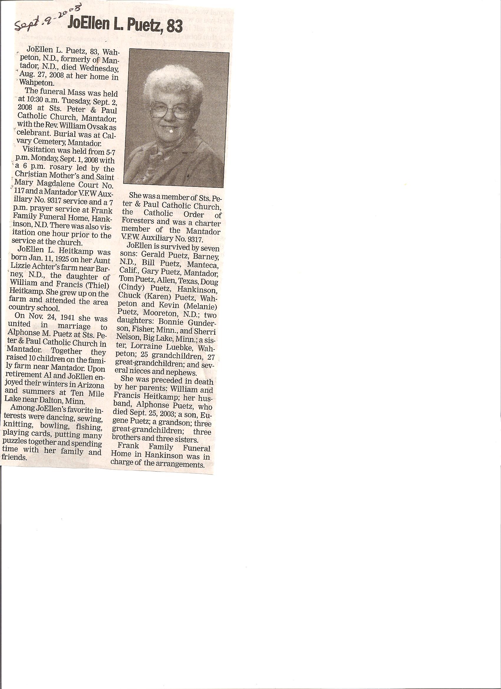 | PUETZ (HEITKAMP), JoEllen L. | 1925/01/11 | Aunt Lizzie Achter's farm near Barney, ND | 2008/09/02 | Her home in Wahpeton, ND | // | Obit | |