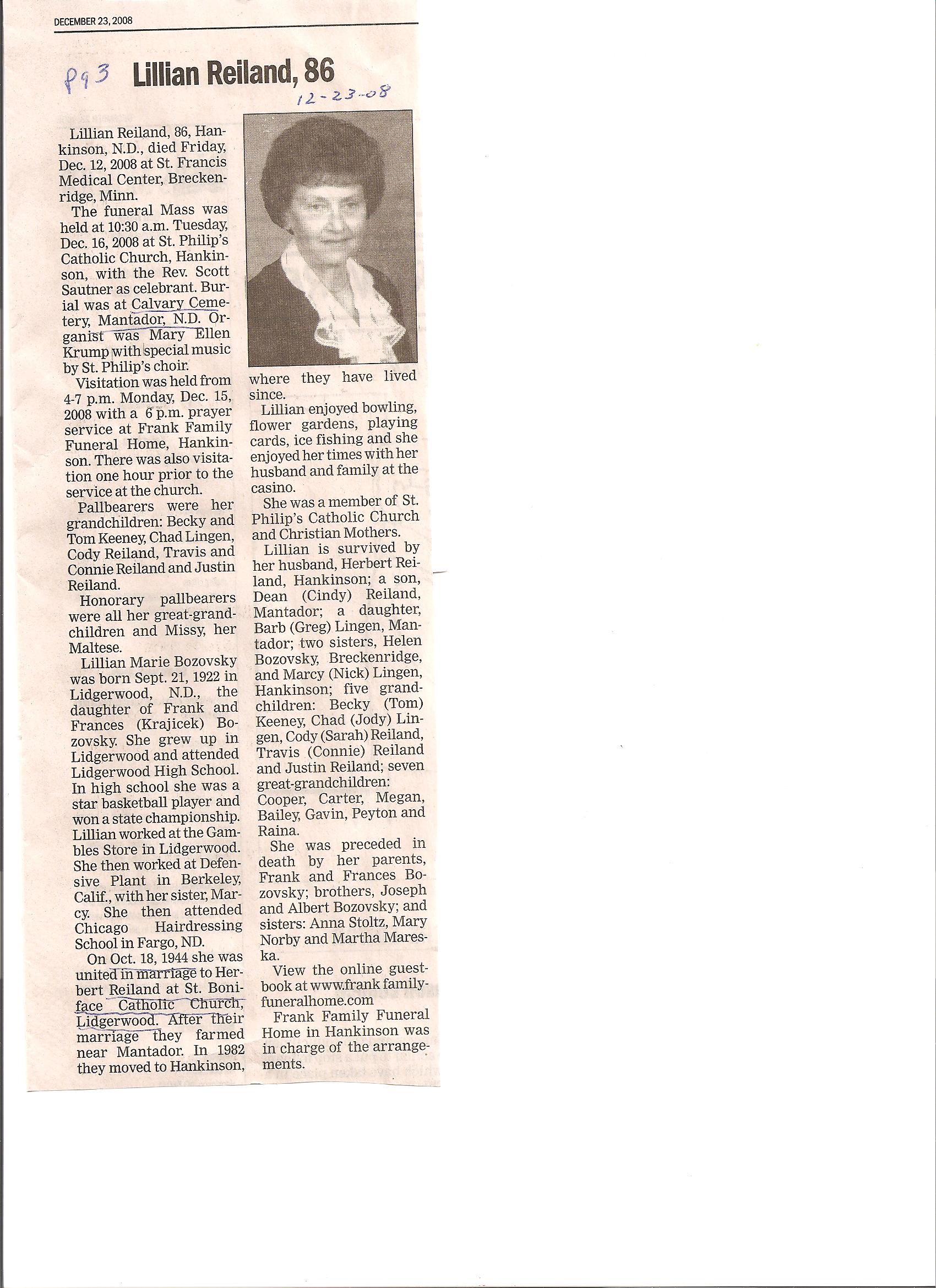 | REILAND (BOZOVSKY), Lillian Marie | Lidgerwood | 1911/09/21 | 2008/12/12 | // | // | Obit | |