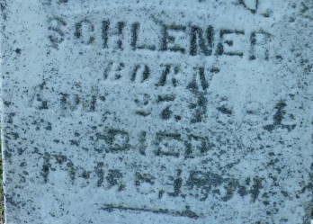 | SCHLENER LaQua, Baby SCHLENER, Frank M. SCHLENER, Bernard SCHLENER, Frank E. SCHLENER, Magdalena | // 1884/04/27 1889 1860 1865 | // | 1894/06/06 1890/02/08 // 1909 1950 | // | // | // | |