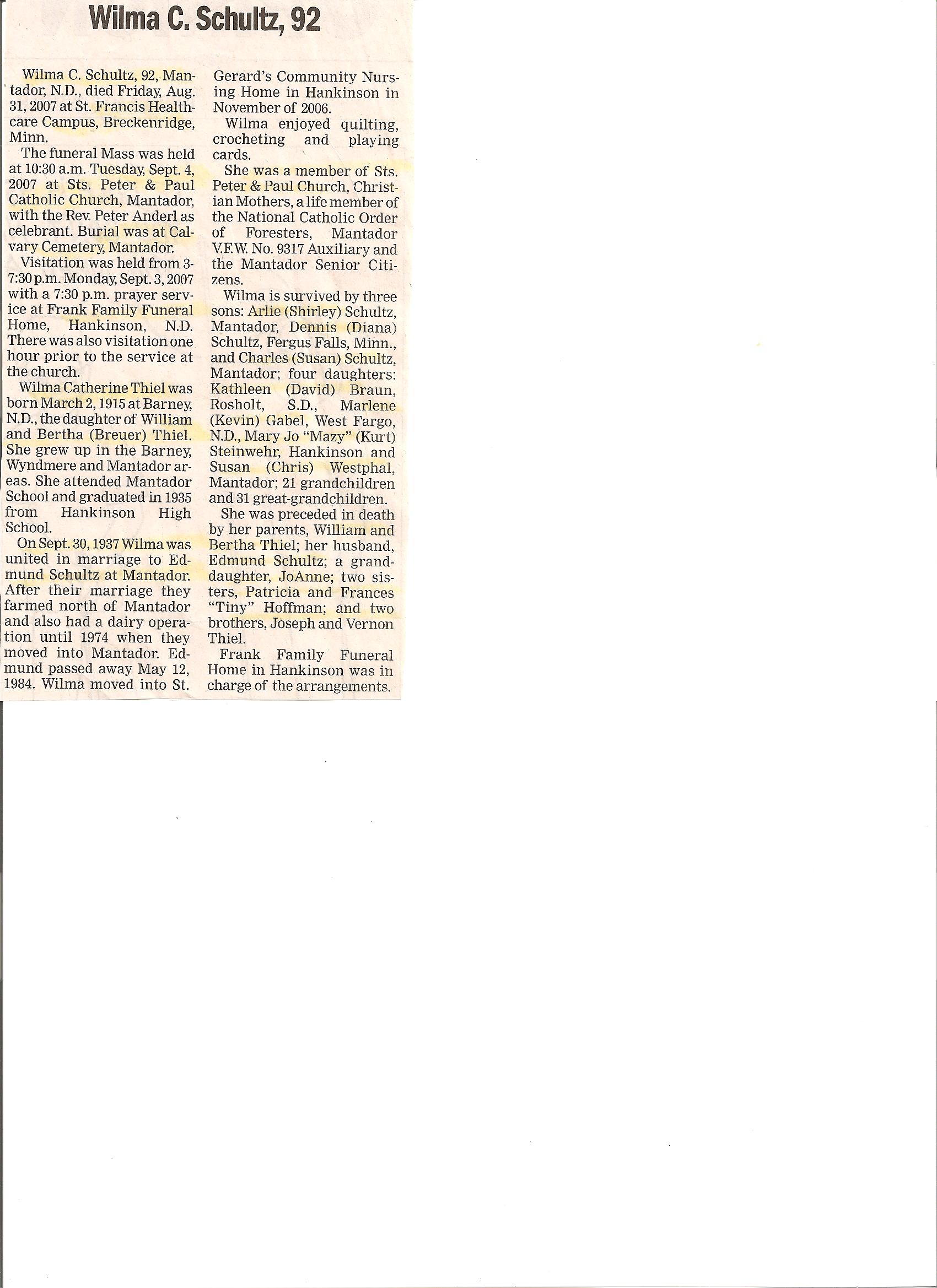 | SCHULTZ (THIEL), Wilma Catherine | 1915/03/02 | Barney, ND | 2007/08/31 | St. Francis Healthcare Campus, Breckenridge | // | Obit | |