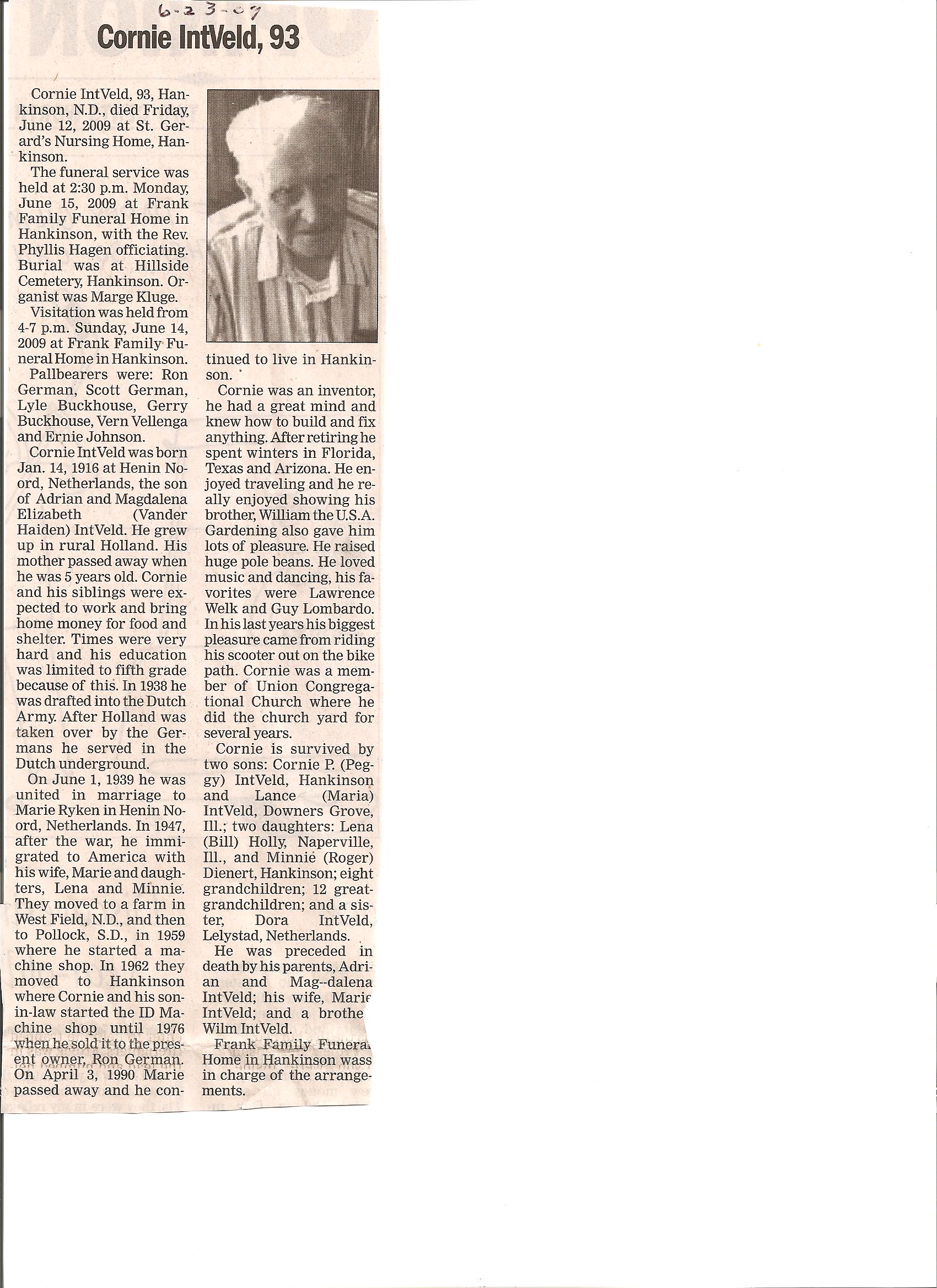 | INTVELD (VANDER HAIDEN), Cornie, 93 | 1916/01/14 | 2009/06/12 | // | // | // | Obit |
