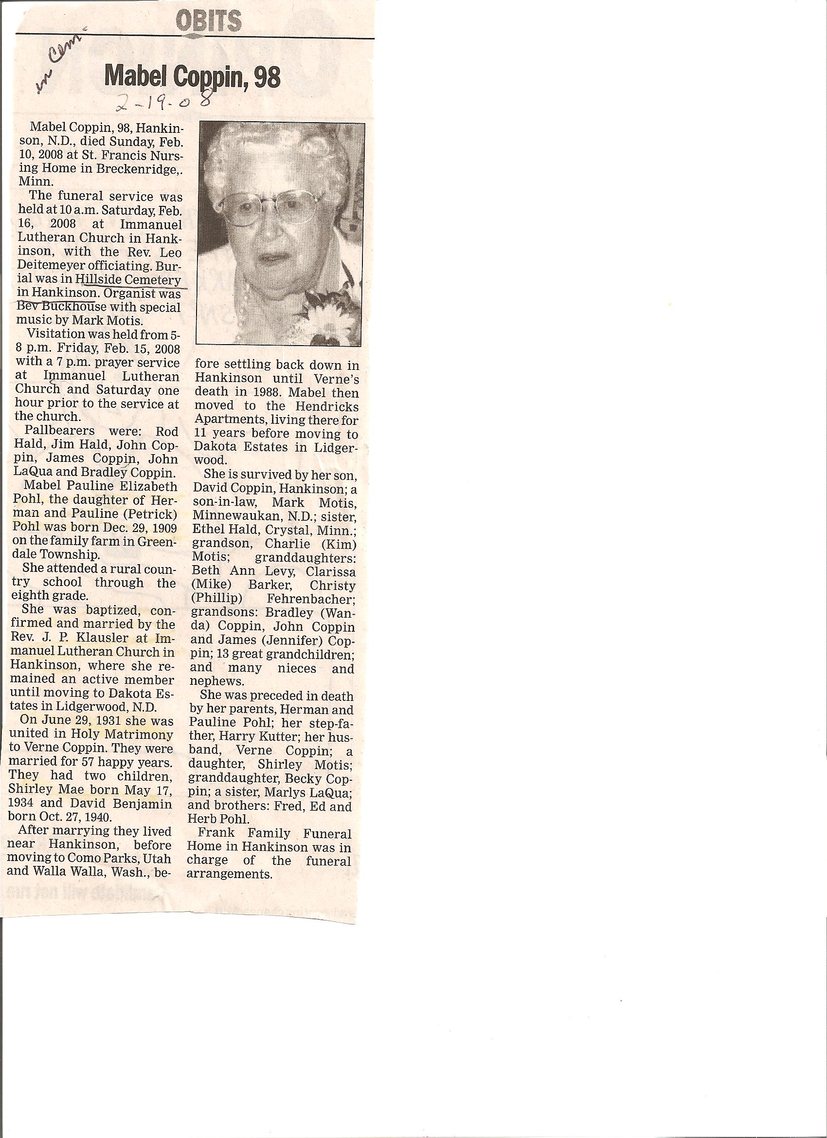 | COPPIN, Mabel (POHL) | 1909/12/29 | 2008/02/10 | // | // | // | Obit |