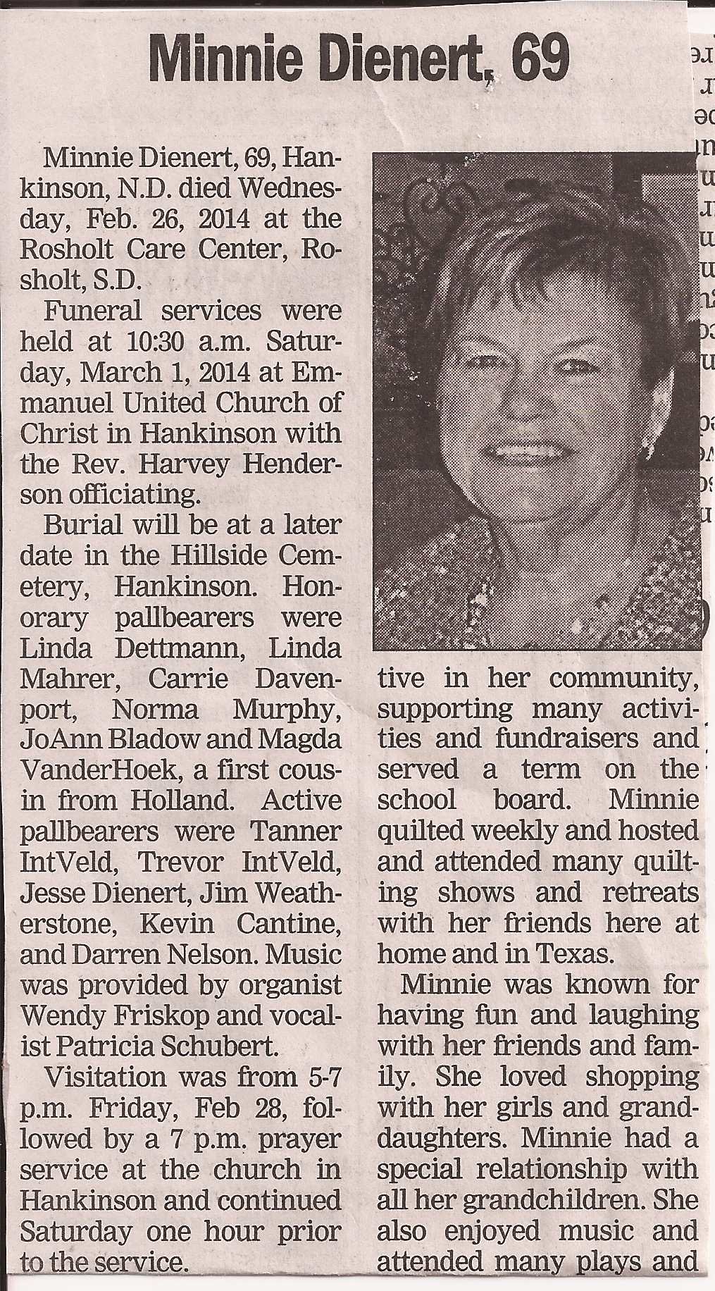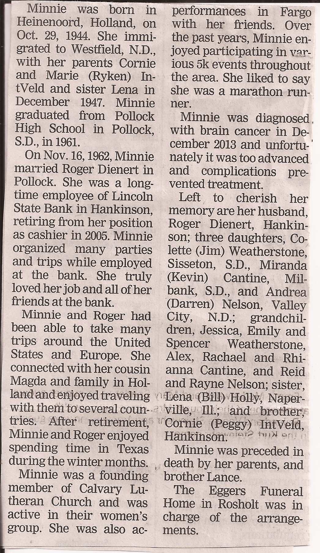 | DIENERT (IiNTvELD>, Minnie | 1944/10/29 | 2014/02/26 | // | // | // | Obit. Obit |