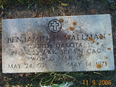 | WAHLMAN,Benjamin H. NORTH DAKOTA PFG 222 AAA SLT BN CAC WORLD WAR II | 1921/05/24 | 1971/05/14 | Photo | // | *** | // |