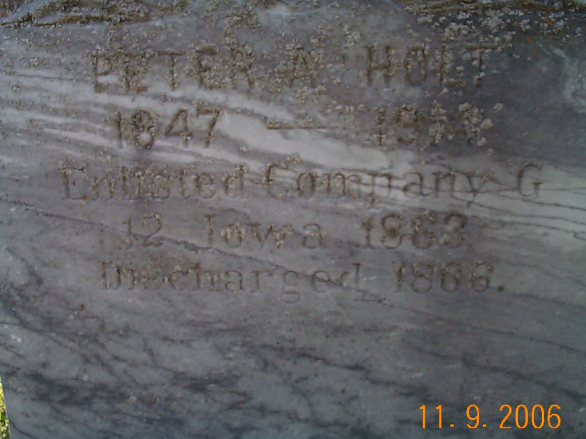 | HOLT, Peter Enlisted Company G. 12- Iowa 1863 Discharged 1866 HOLT, Carrie | 1847 1852 | 1914 1946 | Photo Photo | Photo | *** | // |