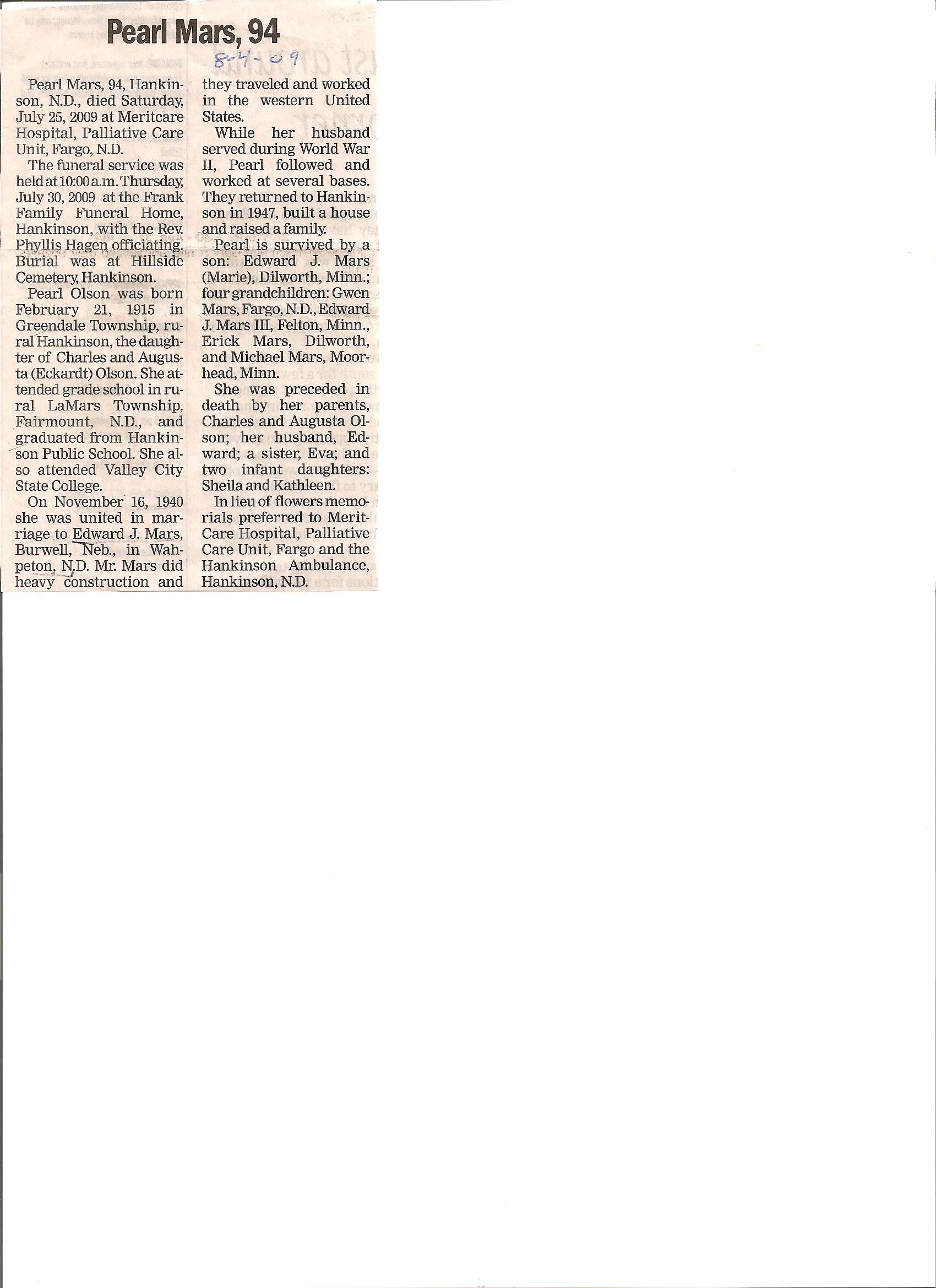 | MARS, Edward N.D. PFC, U.S.A. WWII MARS, Pearl MARS, Sheila Kathleen | 1907/12/12 1915/02/21 ----/07/29 | 1965/07/13 2009/07/25 1943/09/27 | // | // | // | Obit |
