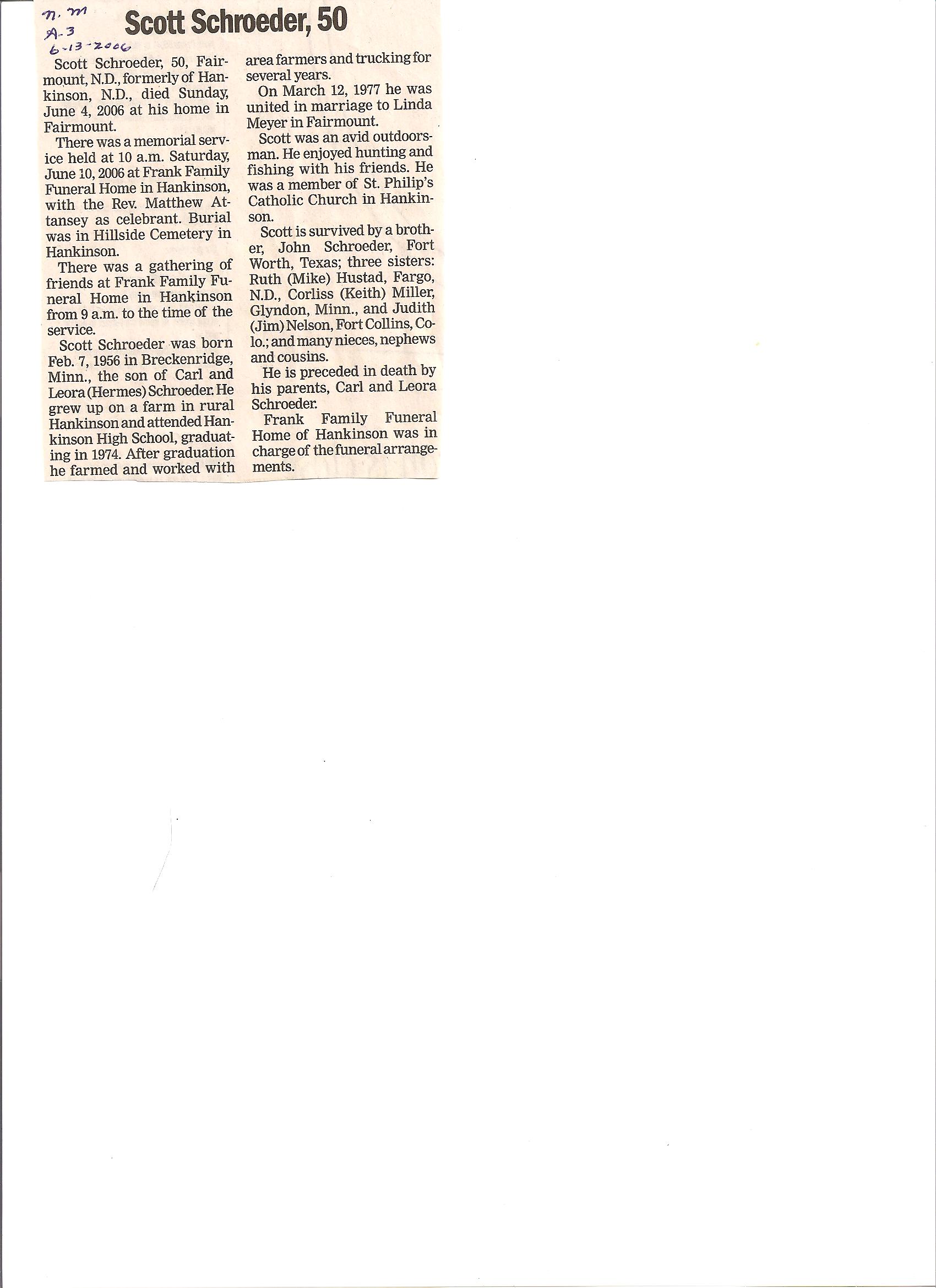 | SCHROEDER, Scott | 1966/02/07 | 2006/06/04 | // | // | // | Obit |