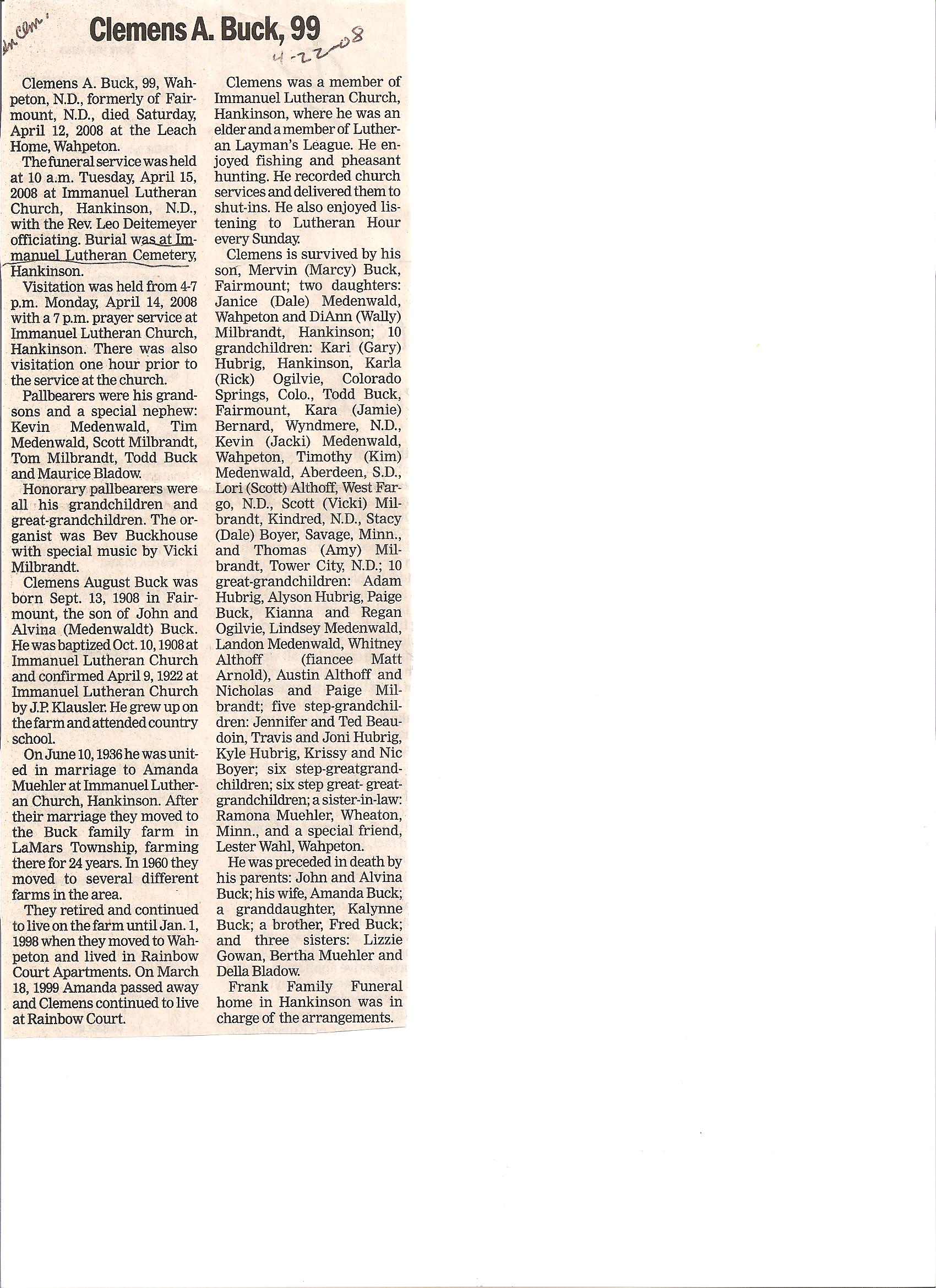 | BUCK, Clemens A. | 1908/09/13 | 2008/04/12 | // | // | Obit | ||||||