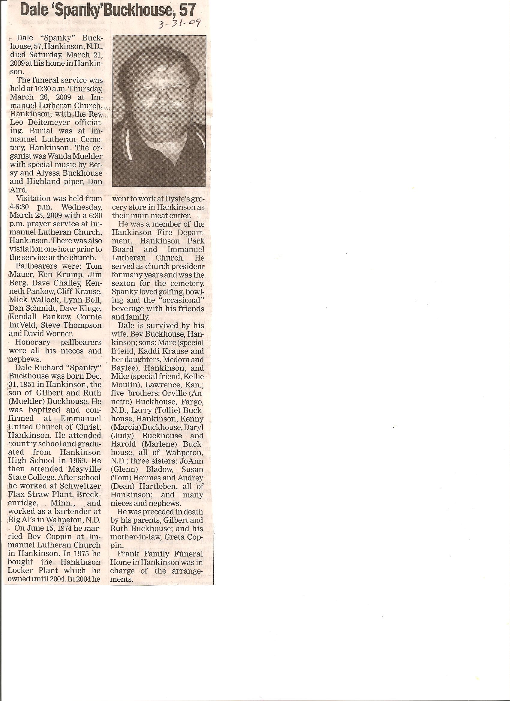 | BUCKHOUSE, Dale 'Spanky' | 1951/12/31 | 2009/03/21 | // | // | Obit | ||||||