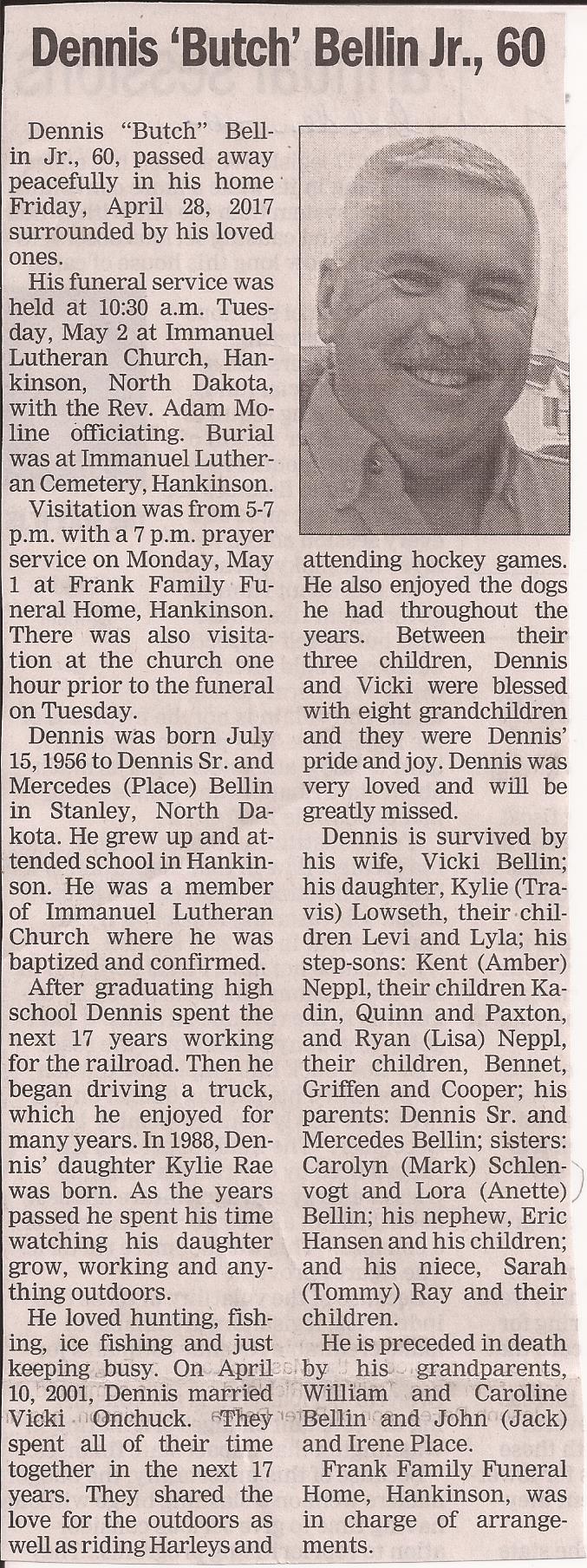 | BELLIN, Dennis 'Butch' JR. | 1956/07/15 | 2017/28/04 | // | // | Obit | ||||||