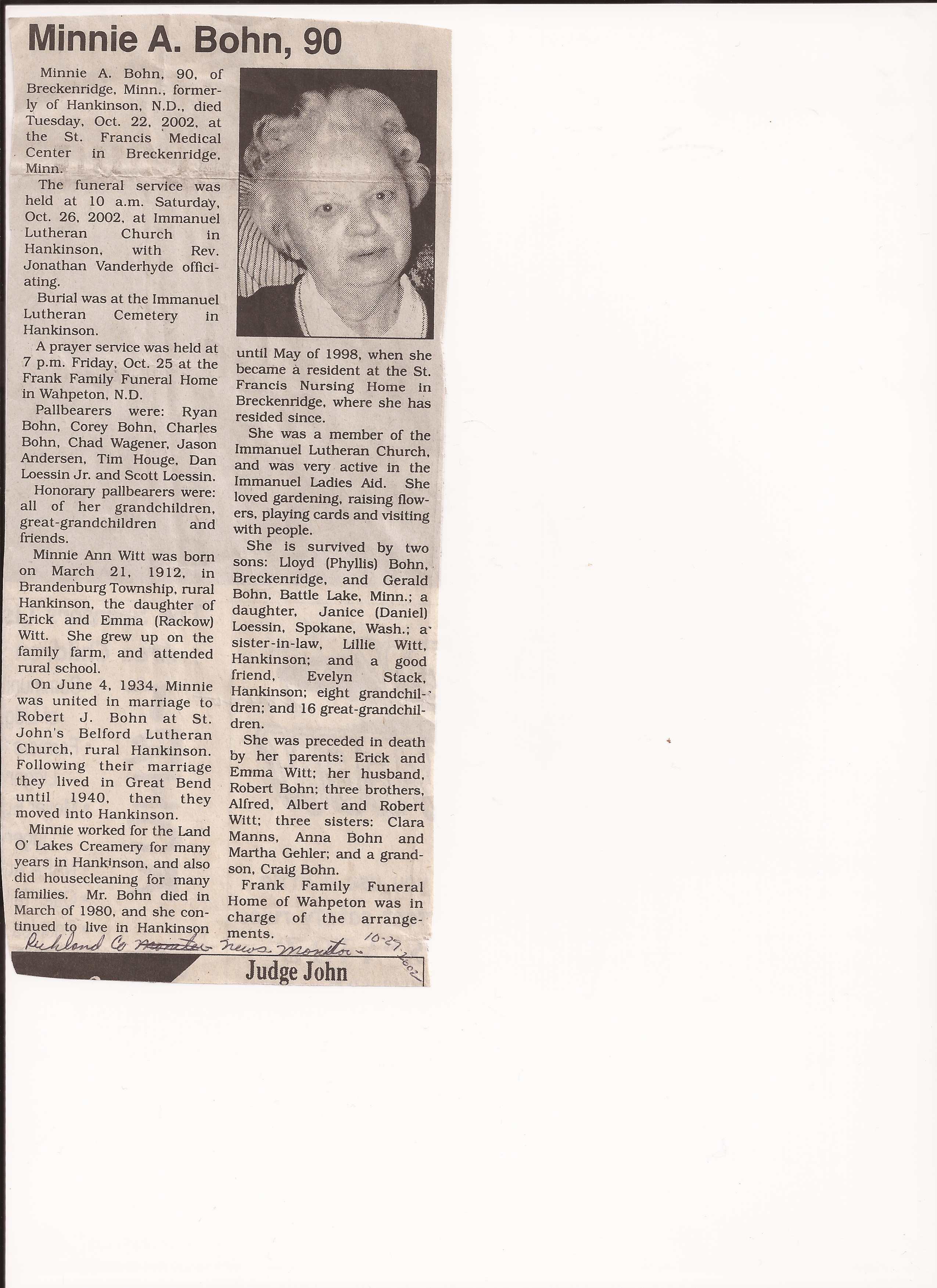 | BOHN, Minnie A. | 1912/03/21 | 2022/10/22 | // | // | Obit | ||||||