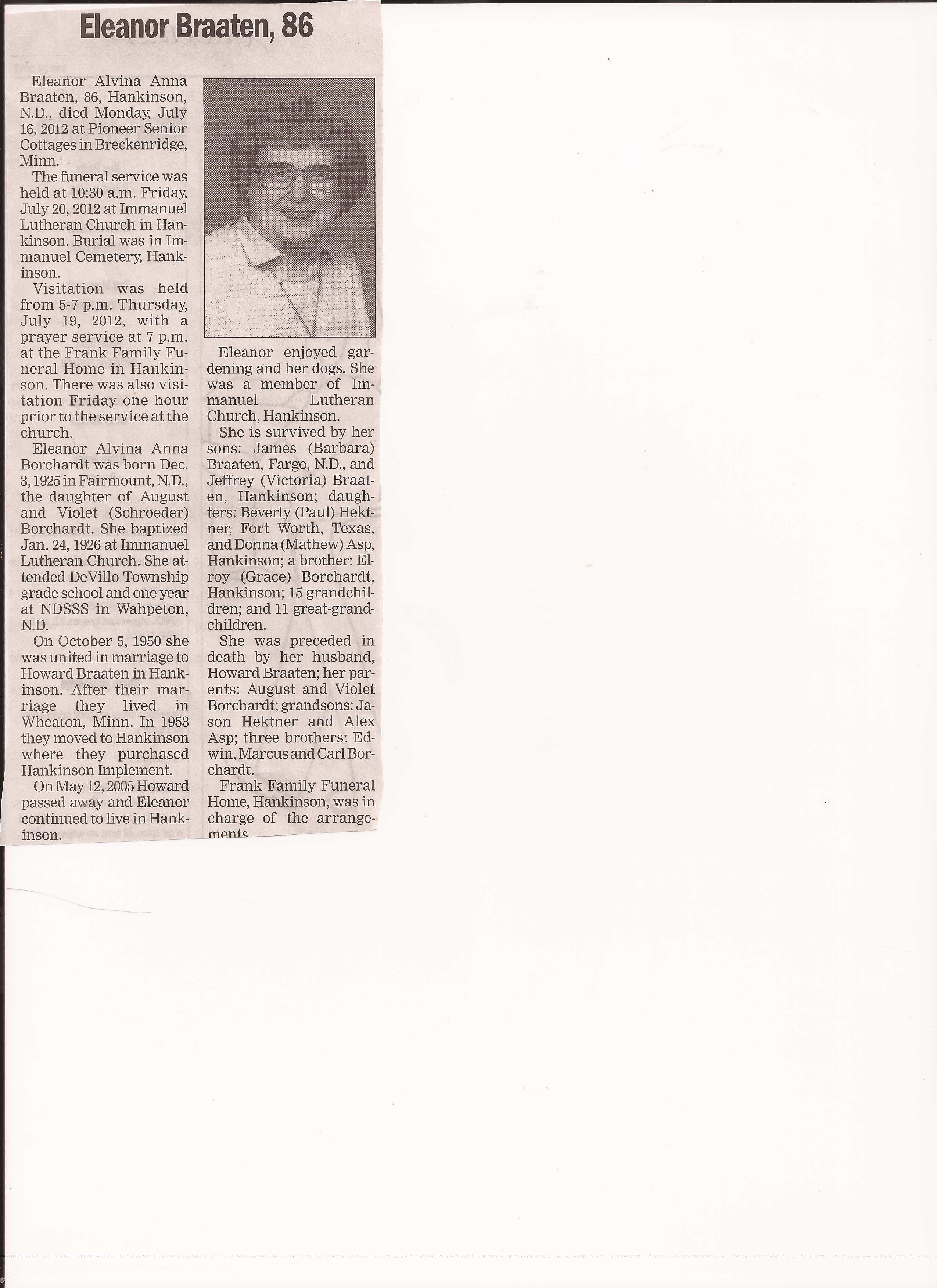 | BRAATEN (BORCHARDT), Eleanor | 1925/12/03 | 2012/07/16 | // | // | Obit | ||||||