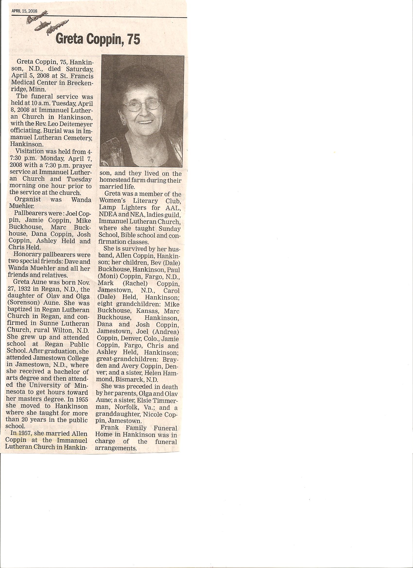 | COPPIN, Greta | 1932/11/27 | 2008/04/05 | // | // | Obit | ||||||