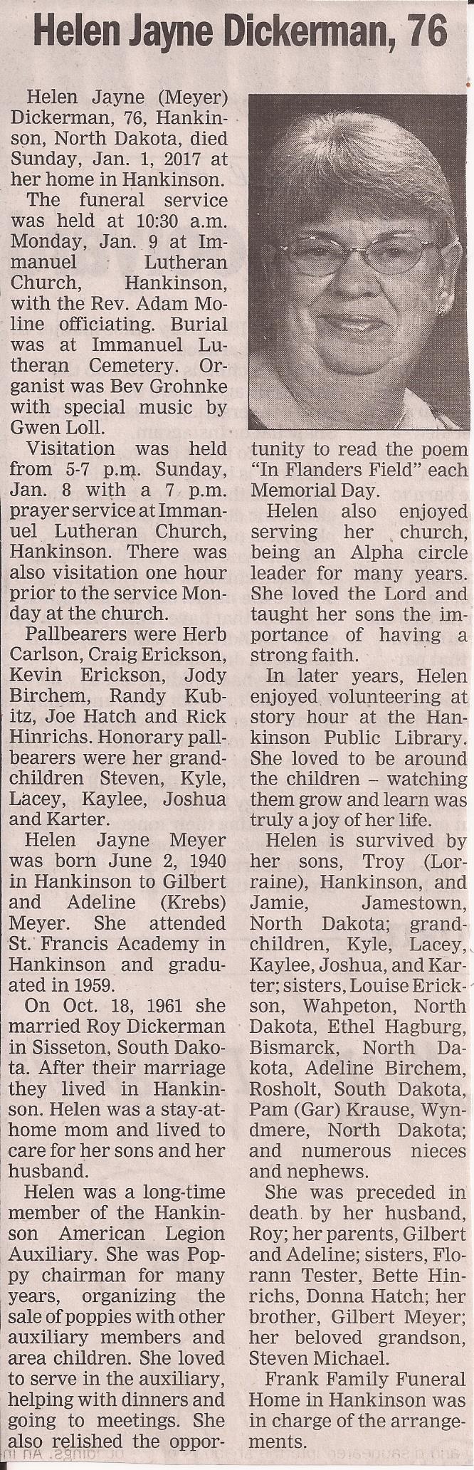 | DICKERMAN (MEYER), Helen Jayne | 1940/06/02 | 2017/01/01 | // | // | Obit | ||||||