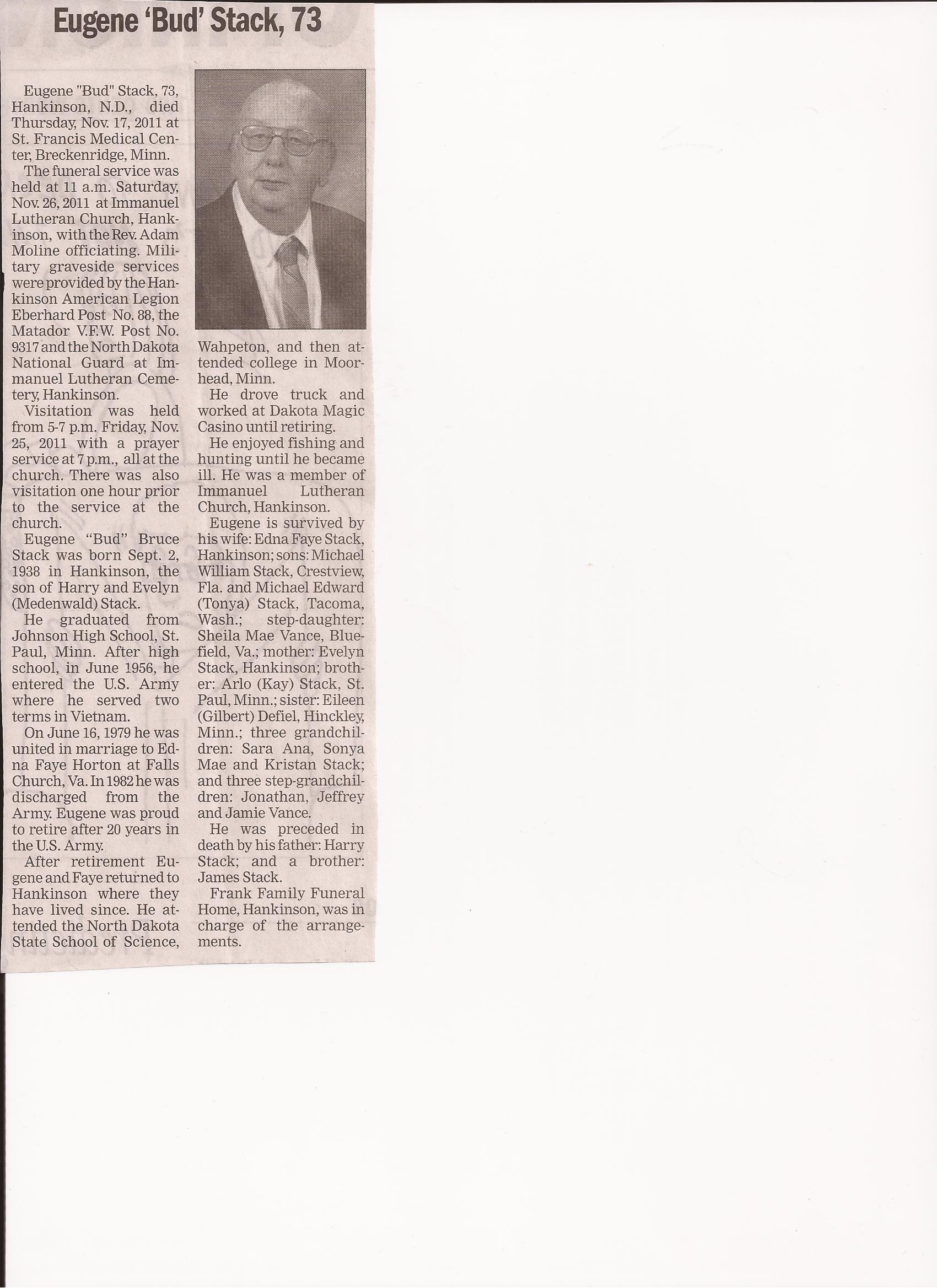 | STACK, Eugene 'Bud' | 1938/09/02 | 2011/11/17 | // | // | Obit | ||||||
