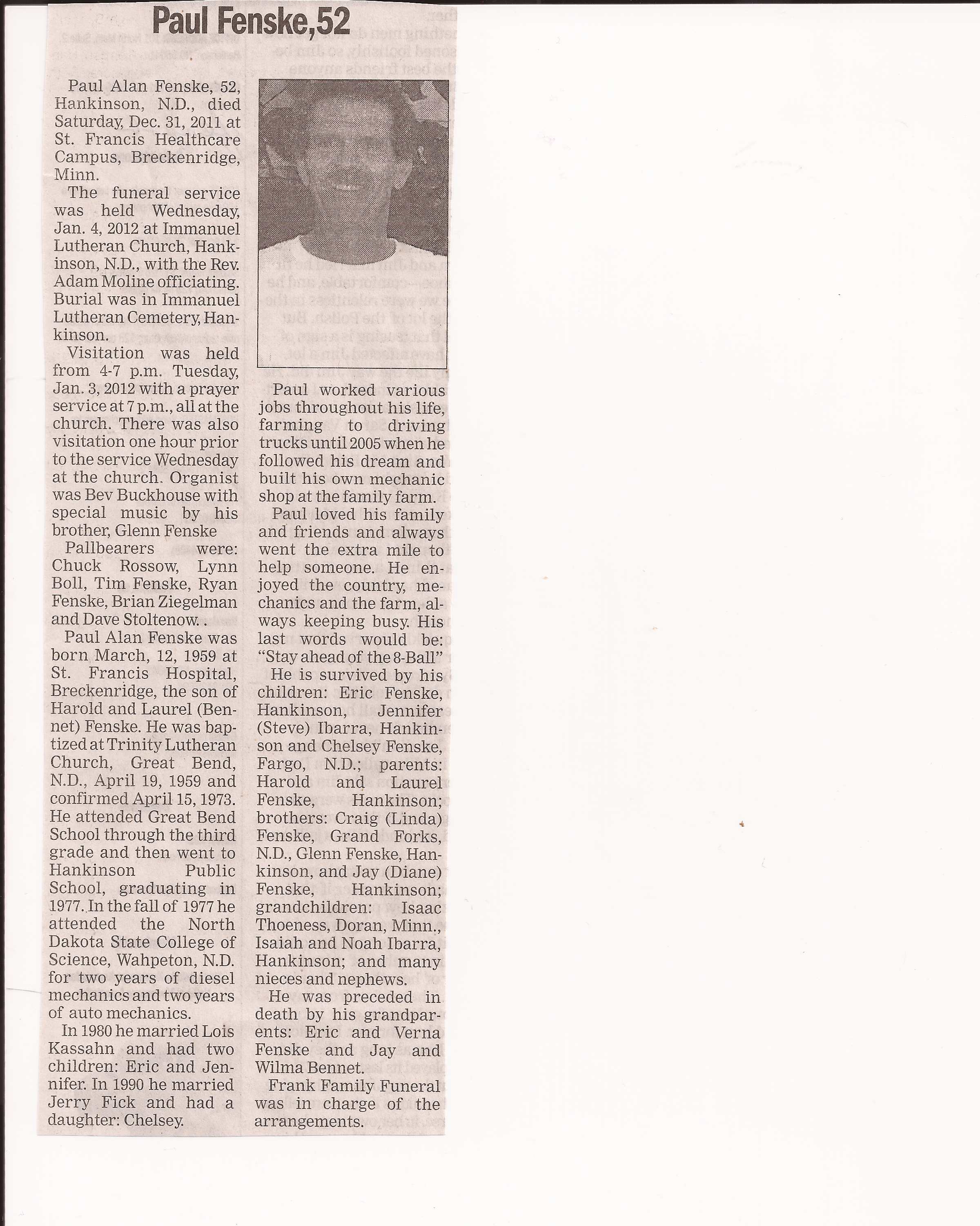 | FENSKE, Paul Alan | 1959/03/12 | 2011/12/31 | // | // | Obit | ||||||
