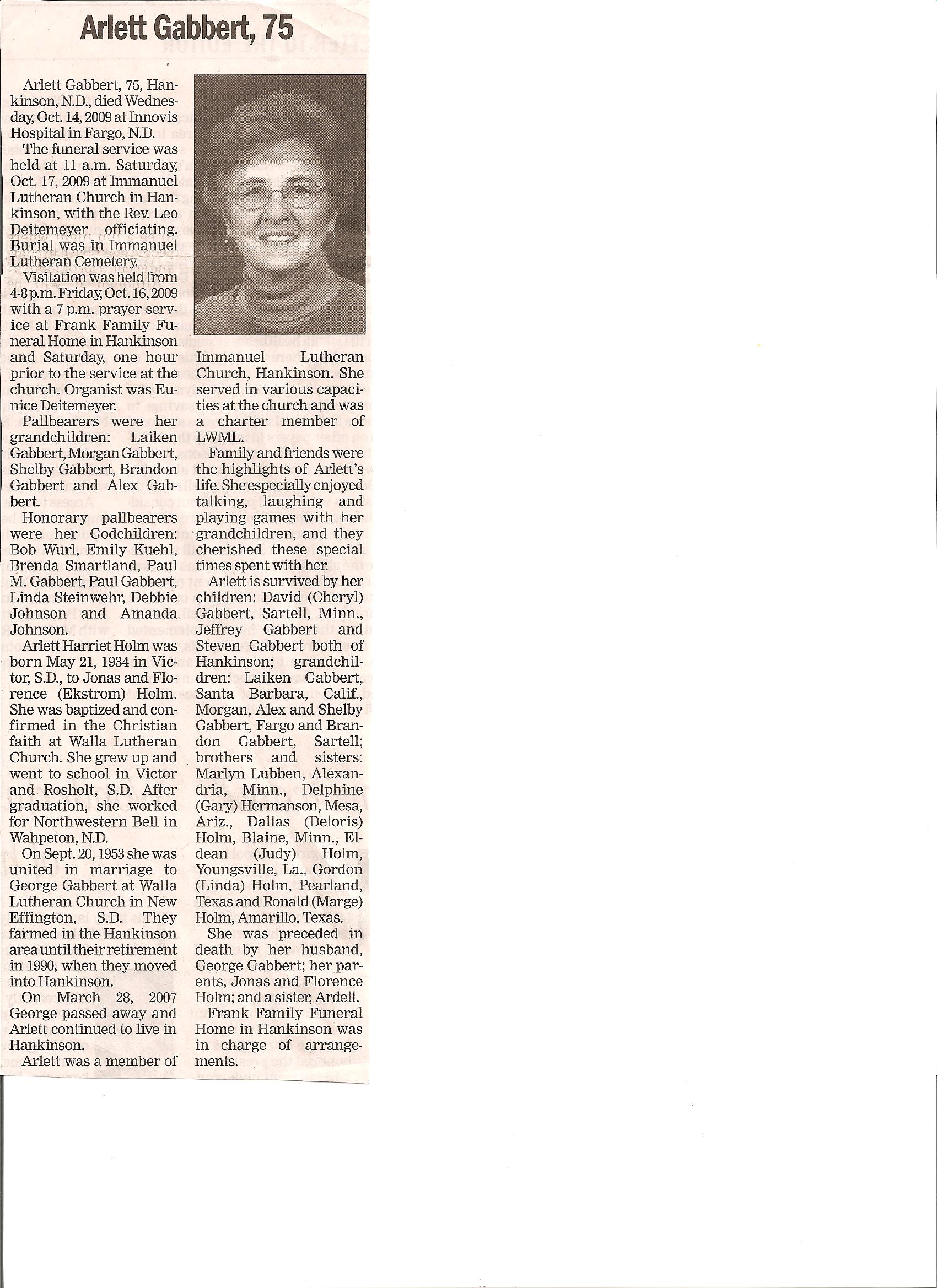 | GABBERT, Arlett | 1934/05/21 | 2009/10/14 | // | // | Obit | ||||||