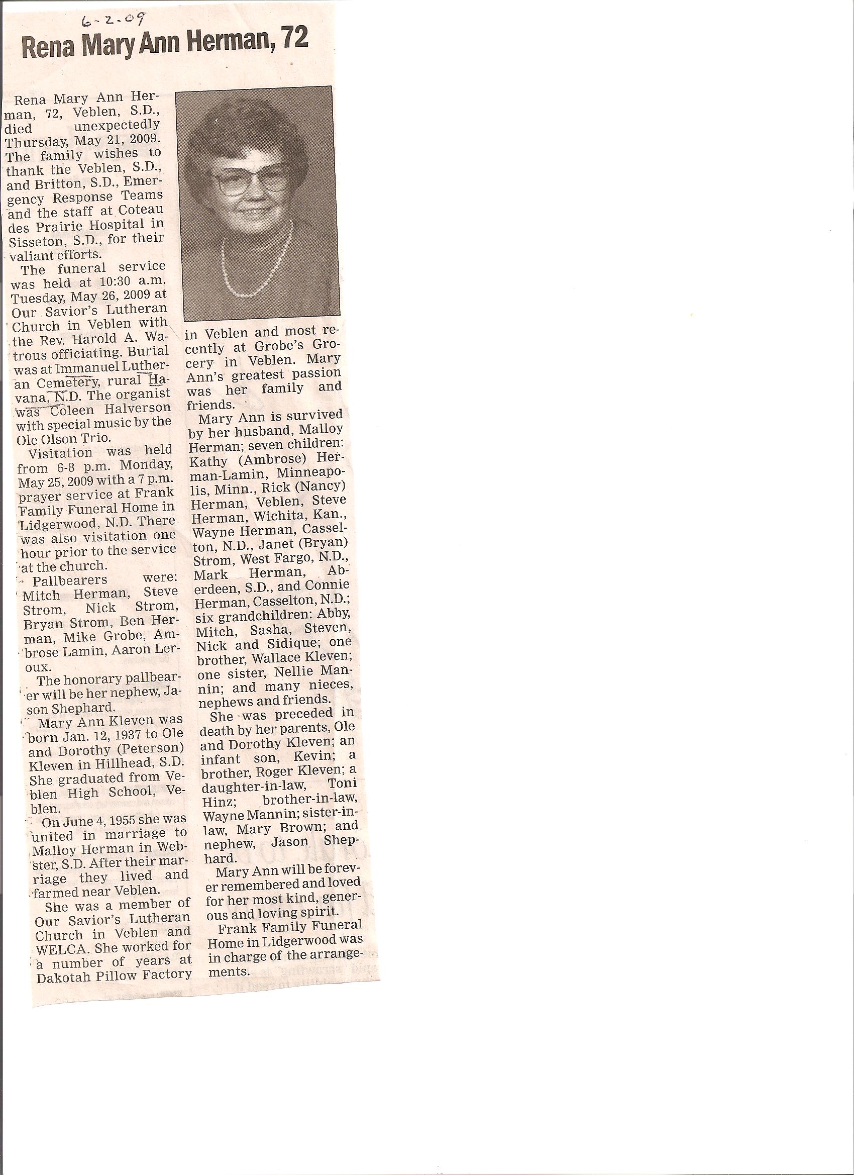 | HERMAN, Rena Mary Ann, 72 | 1937/01/01 | 2009/05/21 | // | // | Obit | ||||||