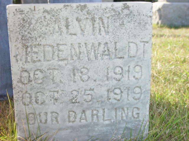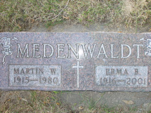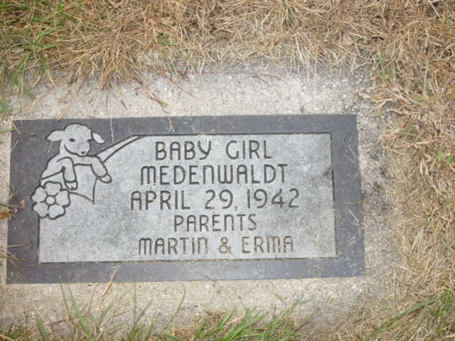 | MEDENWALDT, Martin W. MEDENWALDT (BOHN), Erma Bertha MEDENWALDT, Baby Girl | 1915/10/28 1916/03/25 1942/04/29 | 1980/10/01 2001/07/28 1942/04/29 | Photo* | // | // | ||||||