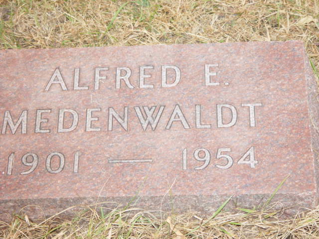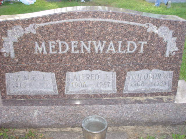 | MEDENWALDT, Alfred F. MEDENWALDT (ZIEGELMANN), Grace E. Alfred & Grace Mar. 1937/06/18 MEDENWALDT, Theodore Wilhelm (Brother) | 1906/07/27 1919/05/12 1908/03/04 | 1987/10/02 ----/--/-- 1983/01/07 | Photo* | // | // | ||||||