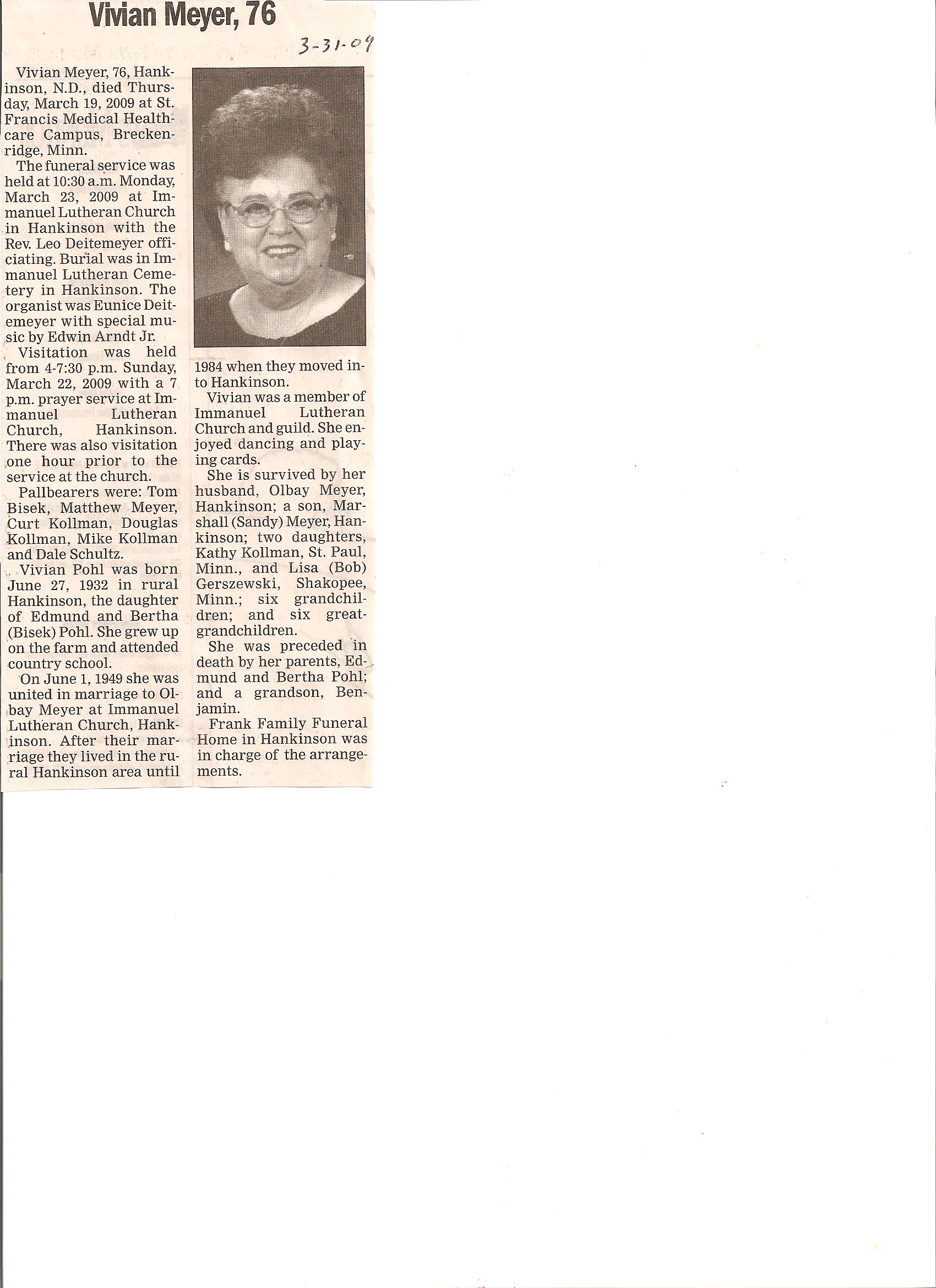 | MEYER (POHL), Vivian (Mar. Olbay 1949/06/01) | 1932/06/27 | 2009/03/19 | // | // | Obit | ||||||