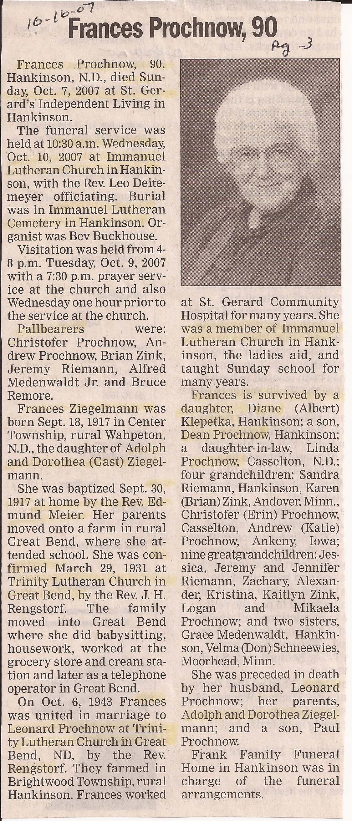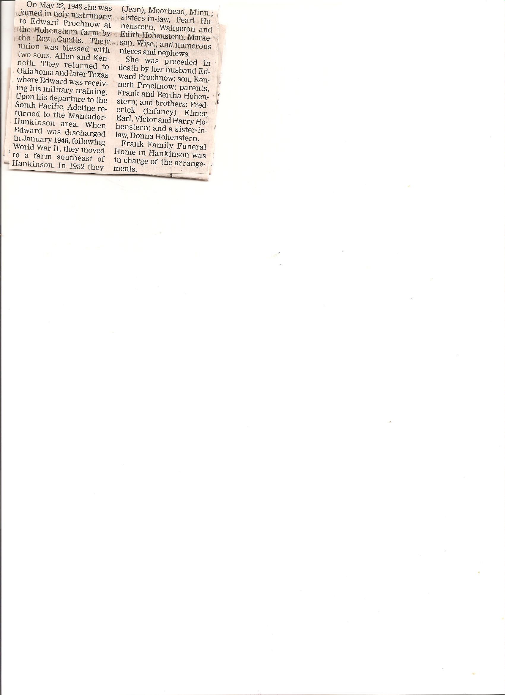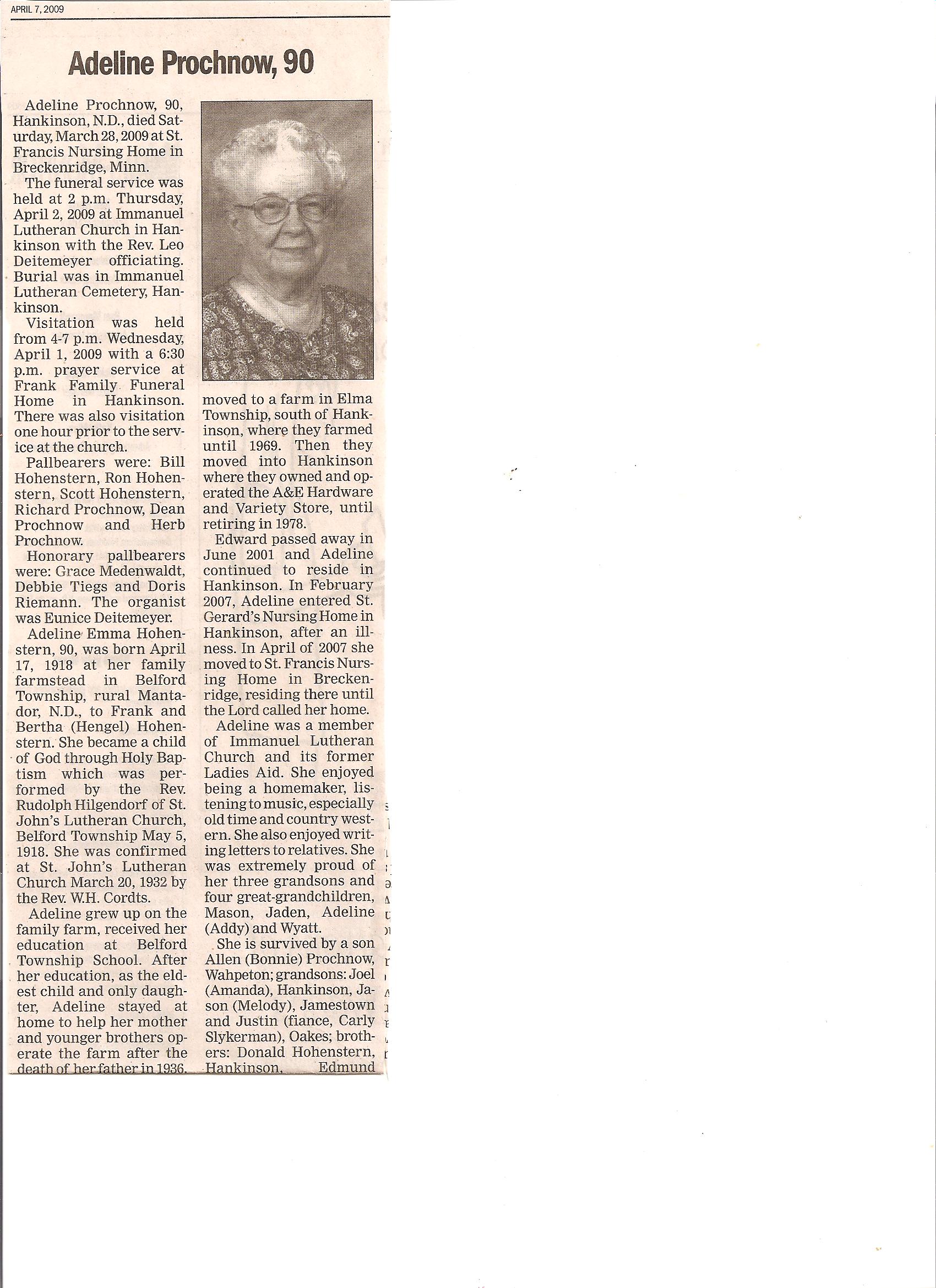 | PROCHNOW, Adeline | 1918/04/17 | 2009/03/28 | // | // | Obit. Obit | ||||||