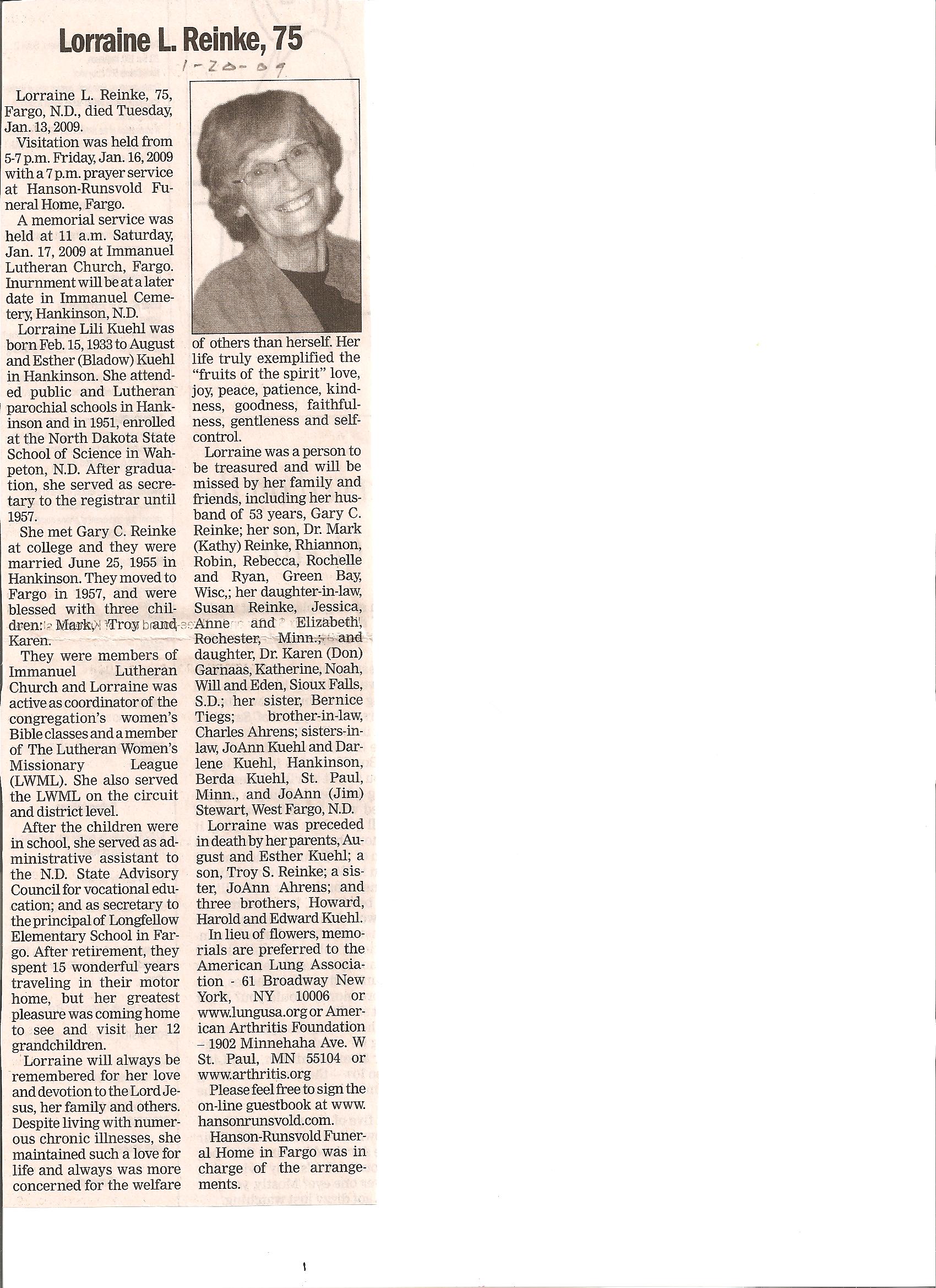 | REINKE (KUEHL), Lorraine Lili | 1933/02/15 | 2009/01/13 | // | // | Obit | ||||||