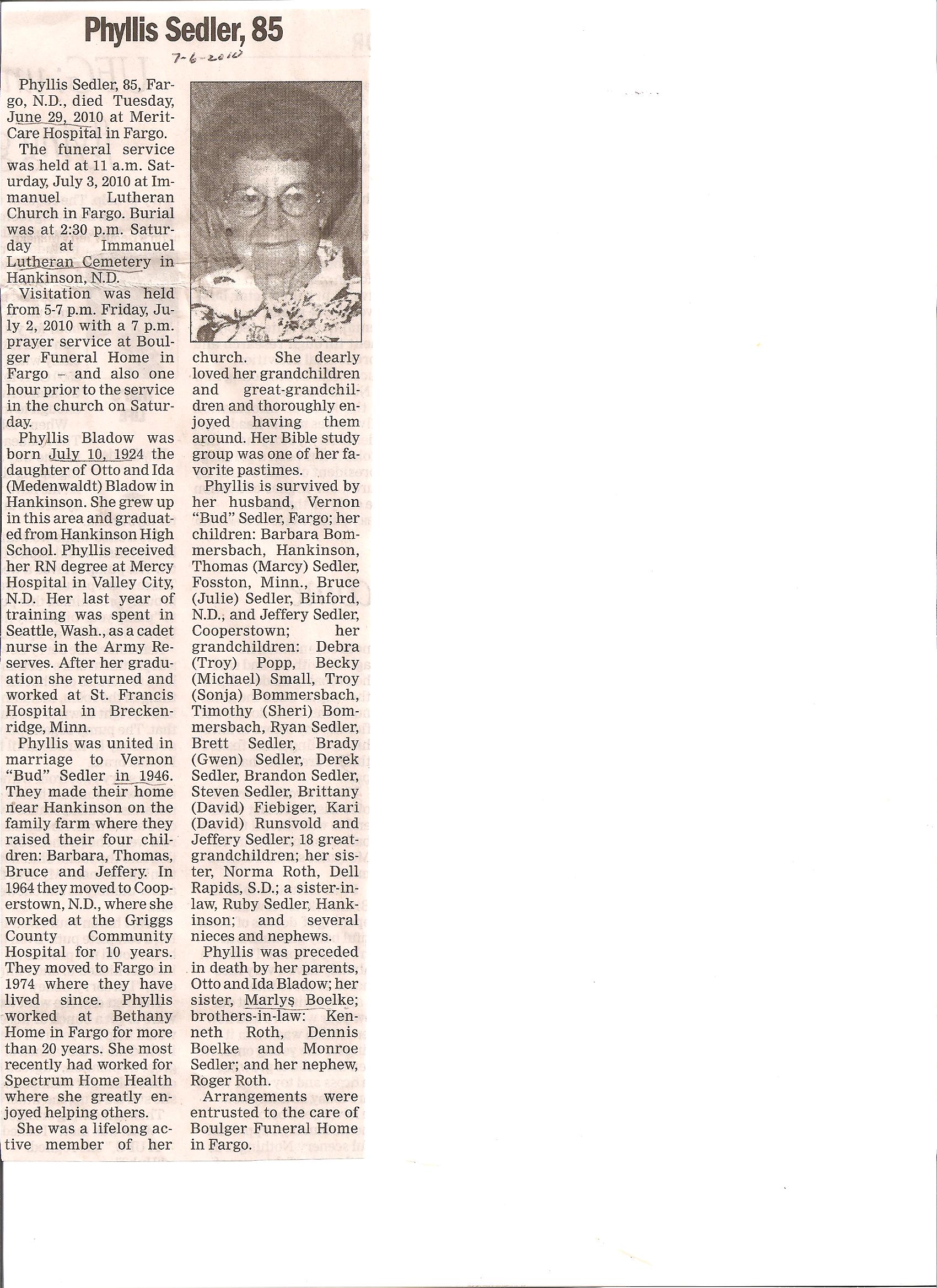 | SEDLER, Phyllis | 1924/07/10 | 2010/06/29 | // | // | Obit | ||||||