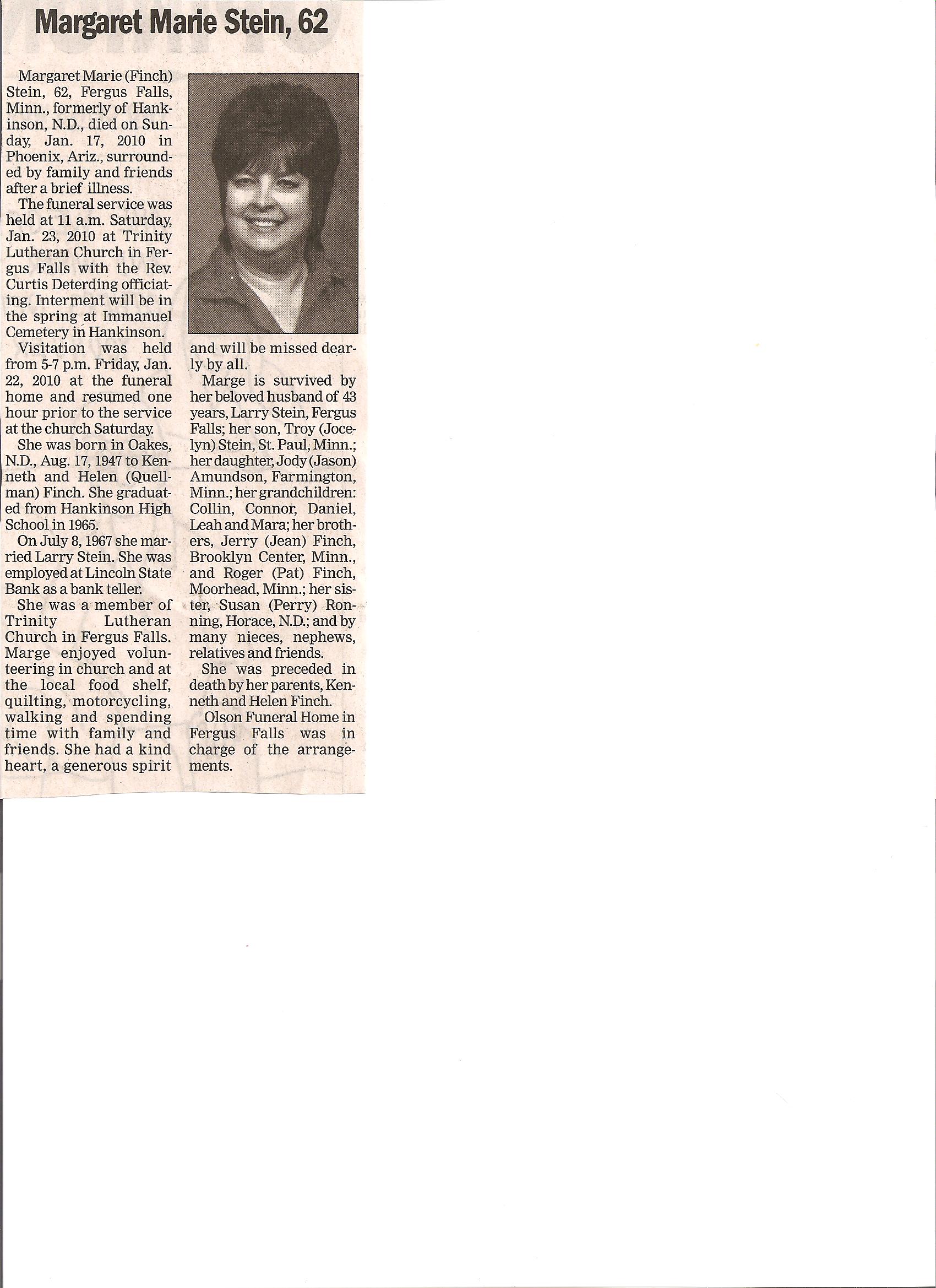 | STEIN (FINCH), Margaret Marie | 1947/08/17 | 2010/01/17 | // | // | Obit | ||||||